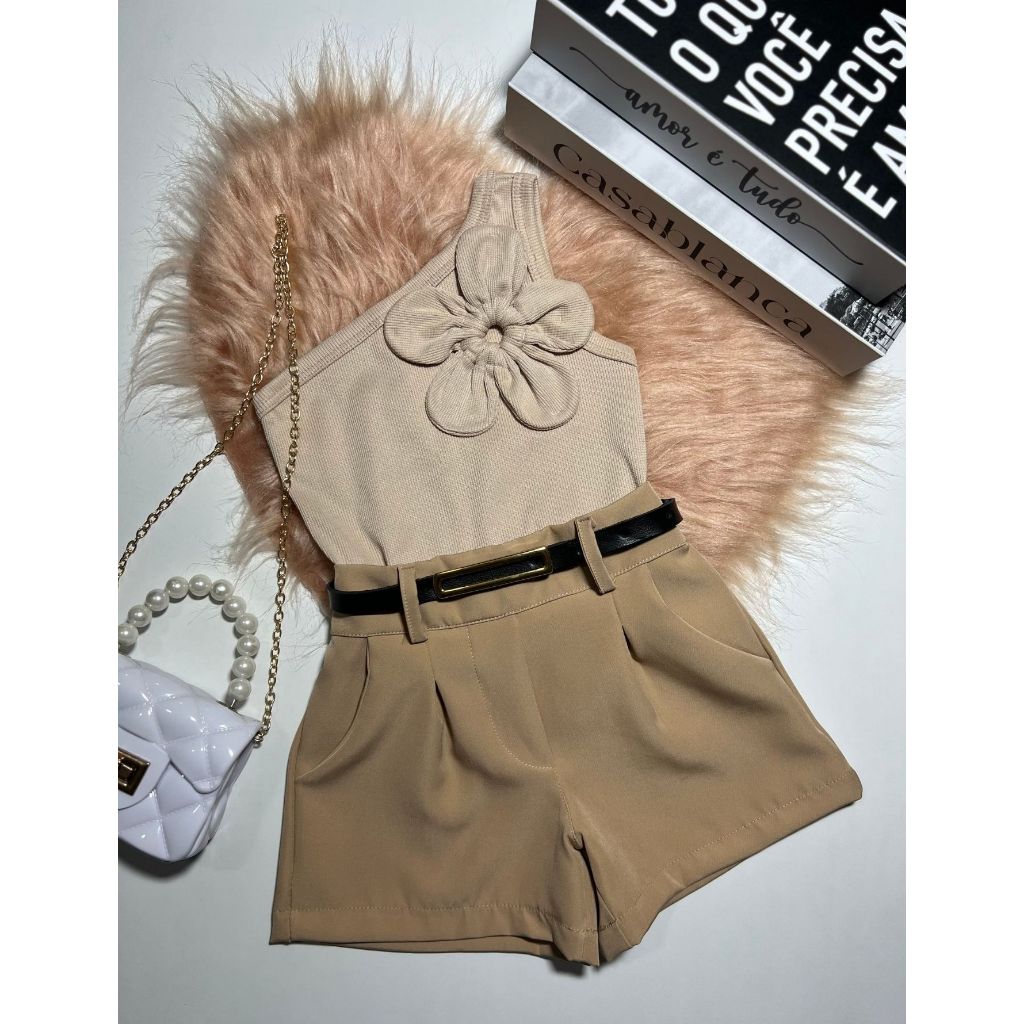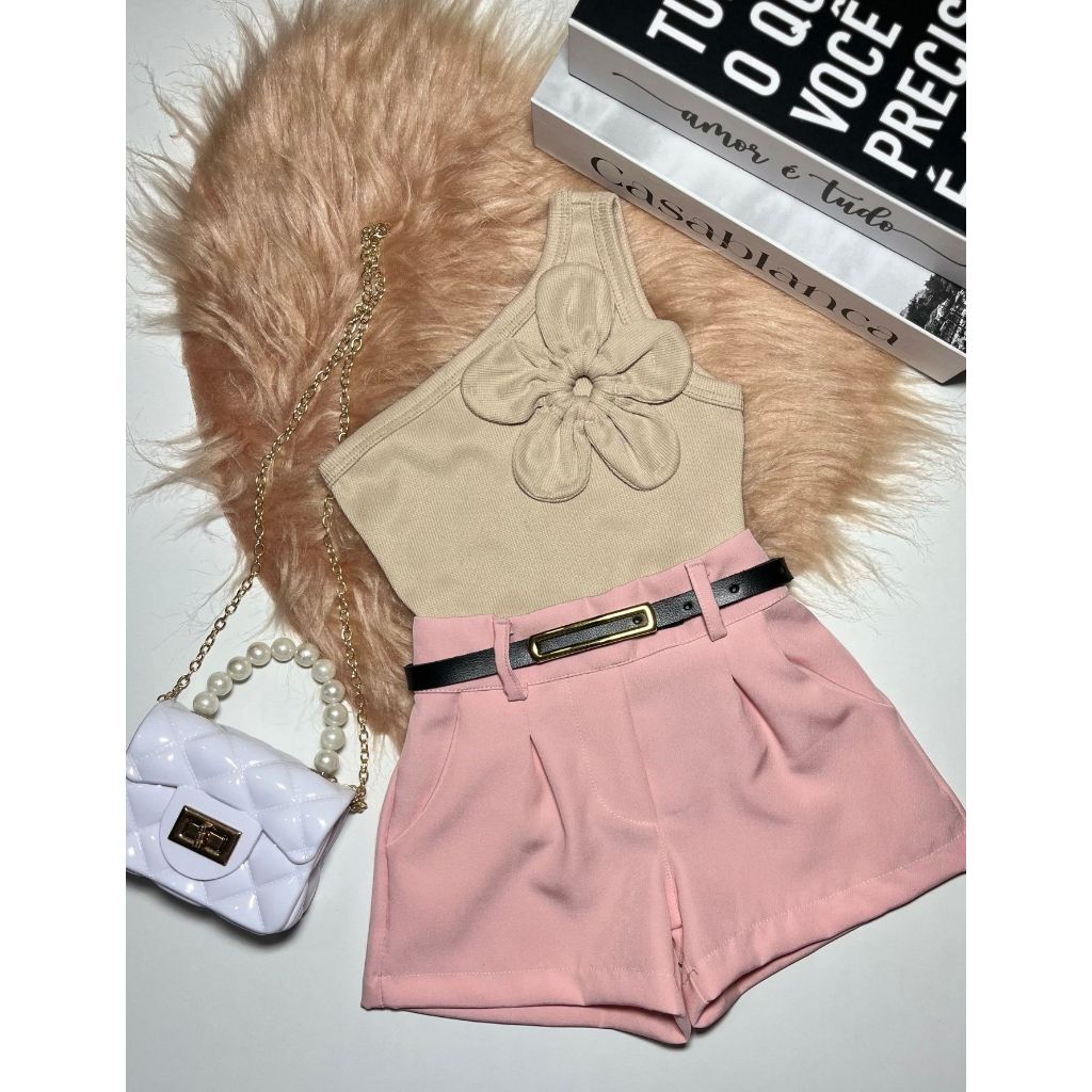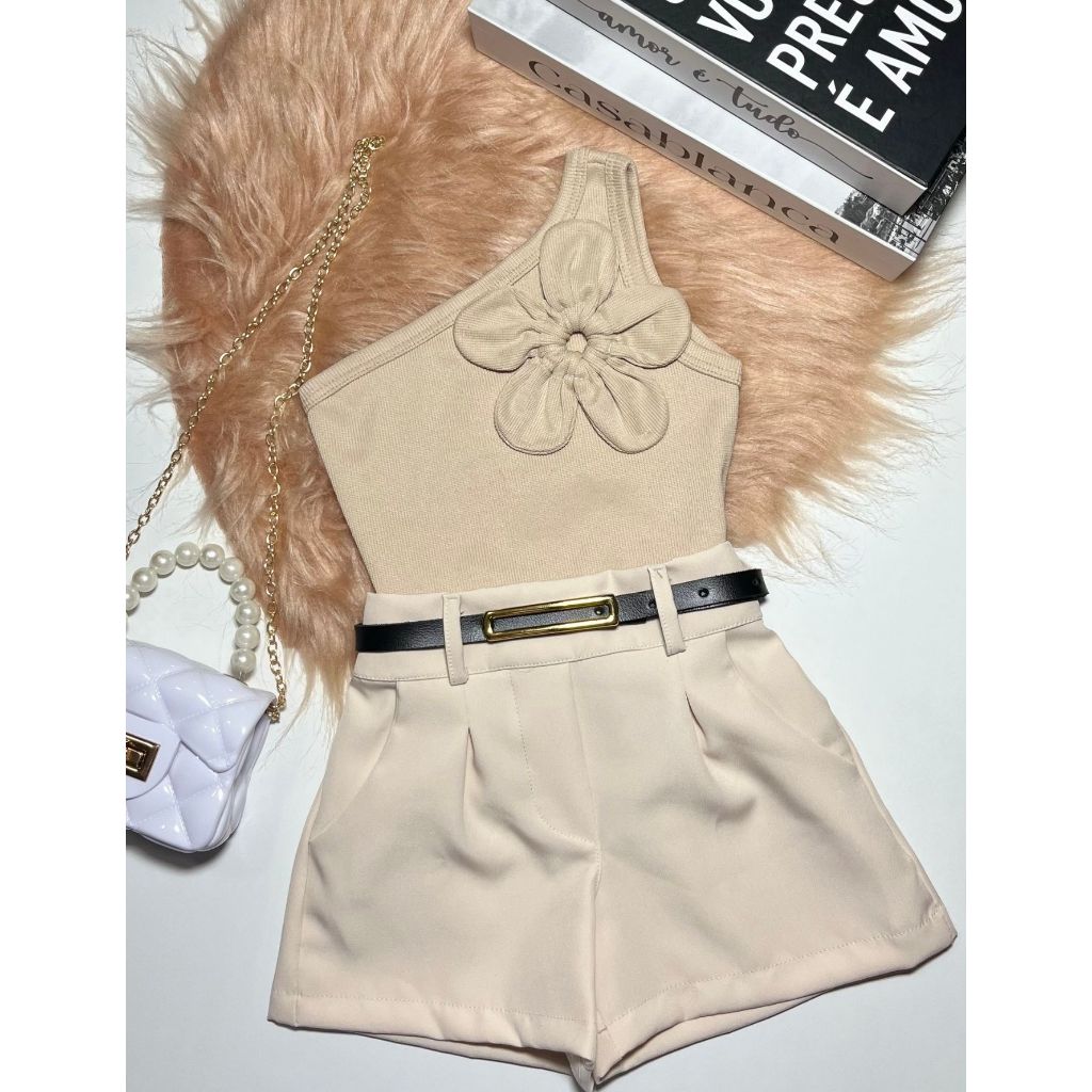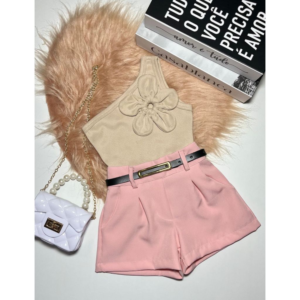 Conjunto Infantil e Juvenil Blusa Flor Short Alfaiataria Luxo Blogueirinha