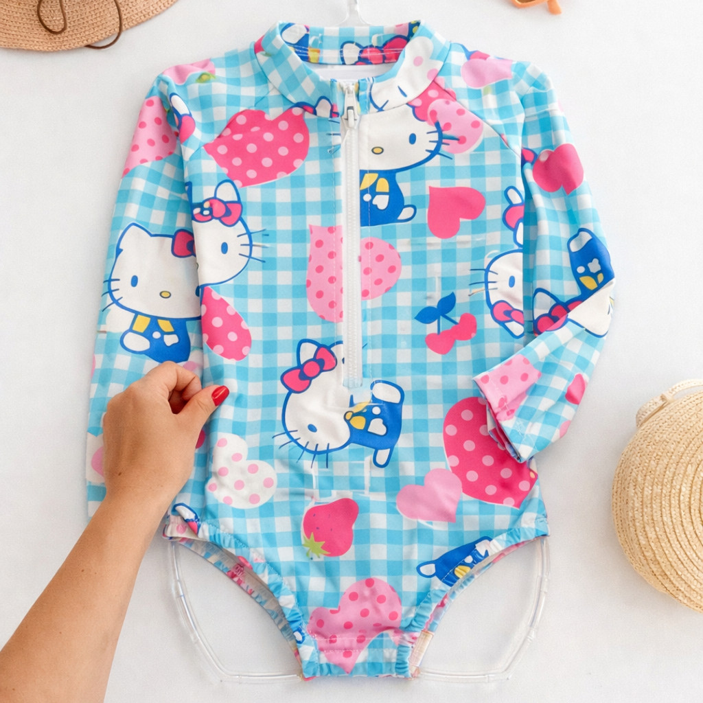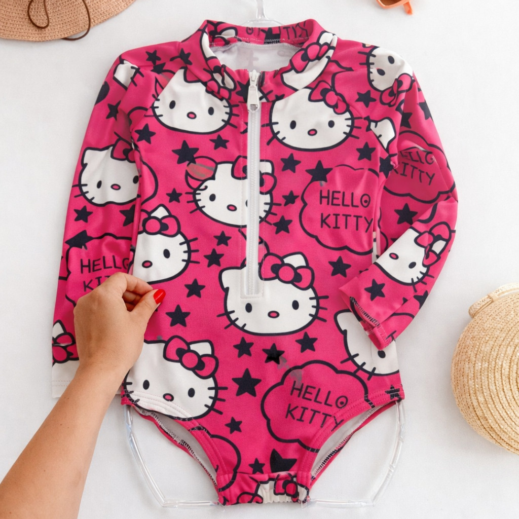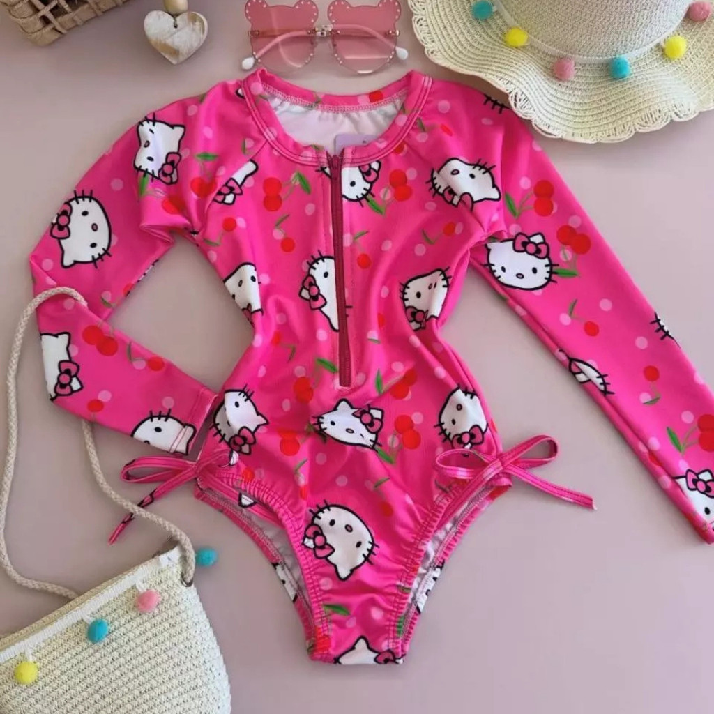 Maiô Infantil Com Ziper Personagens Hello Kitty Para Meninas Com Proteção UV Moda Verão Praia Carnaval