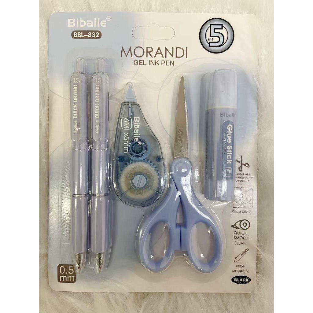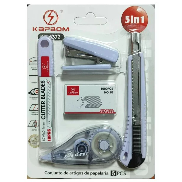 O kit de papelaria inclui cortador, grampeador e fita corretiva para escritórios escolares