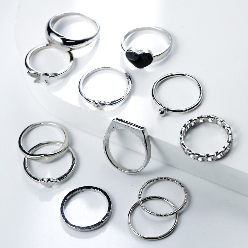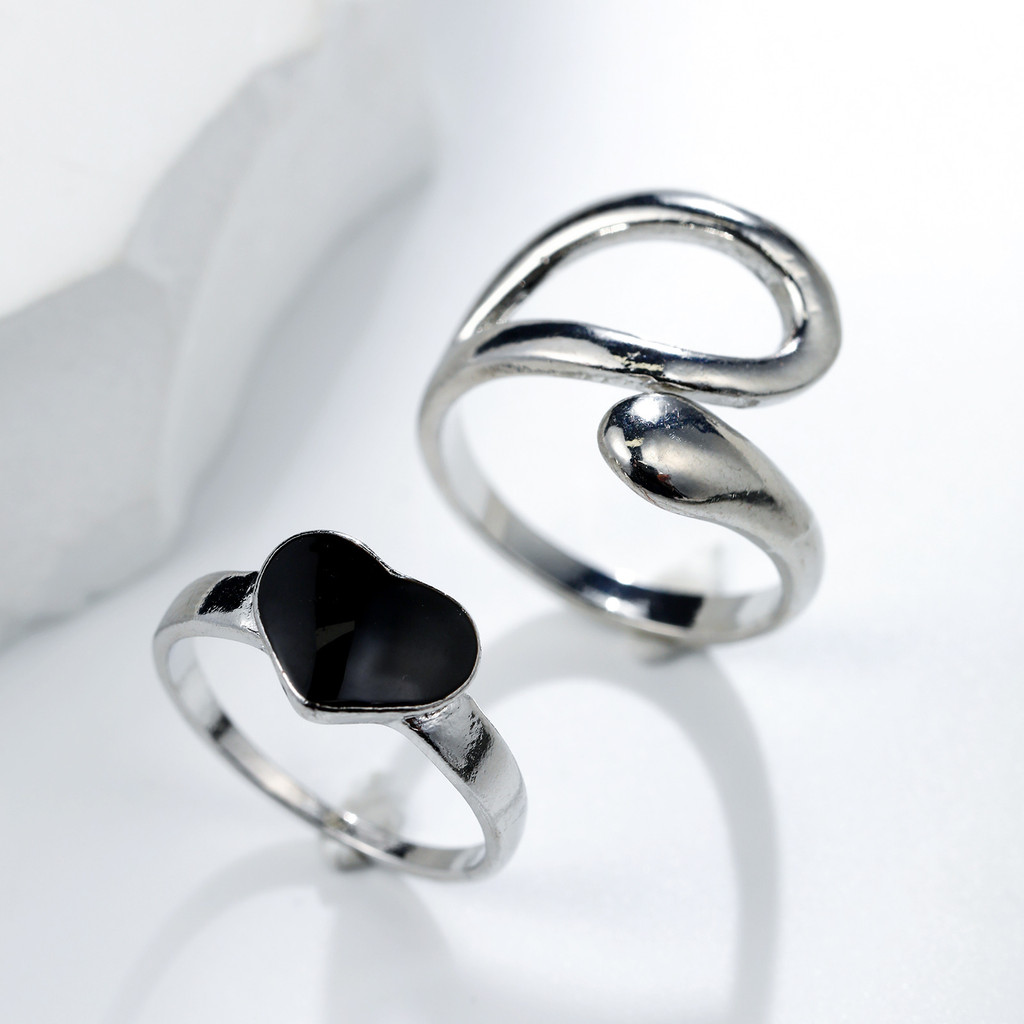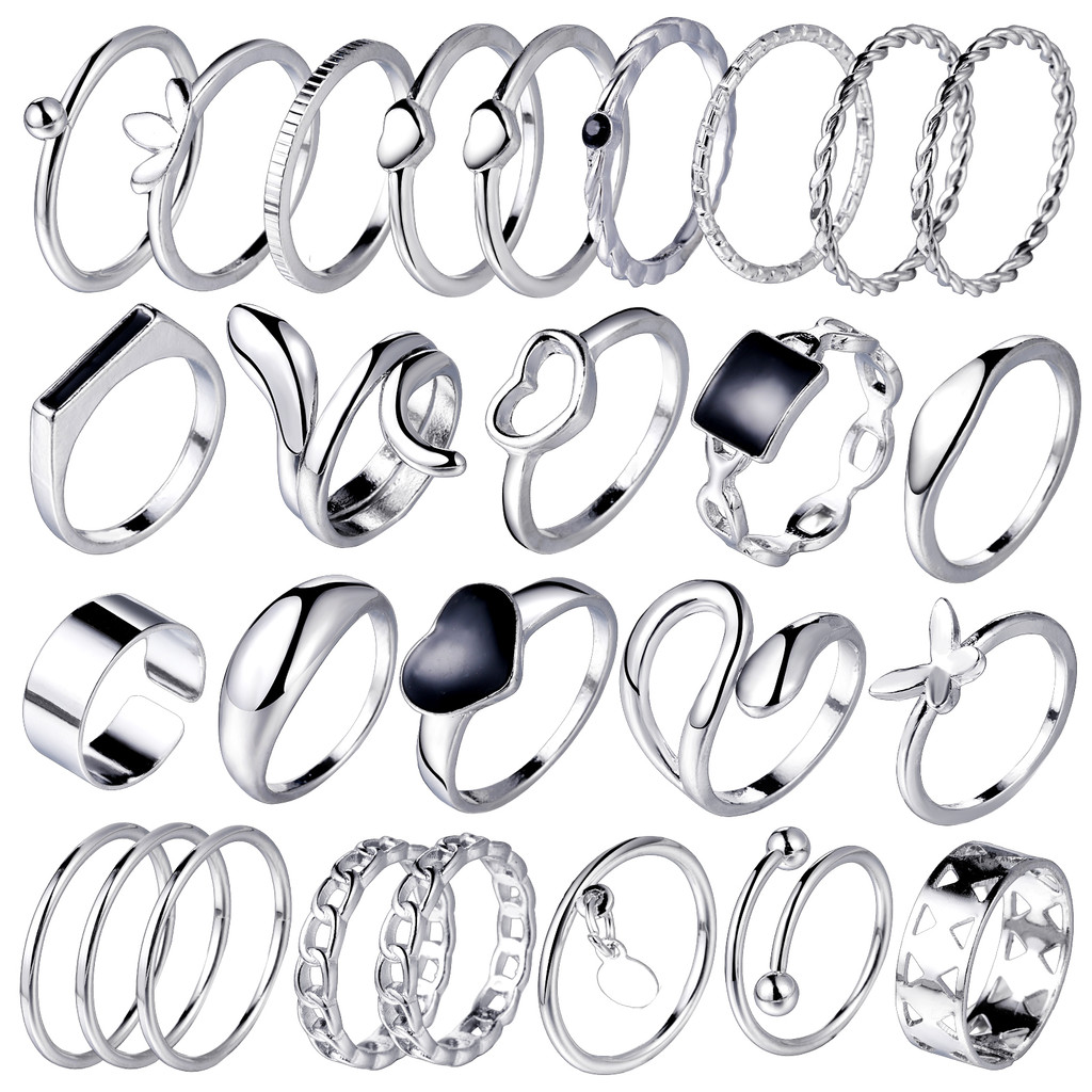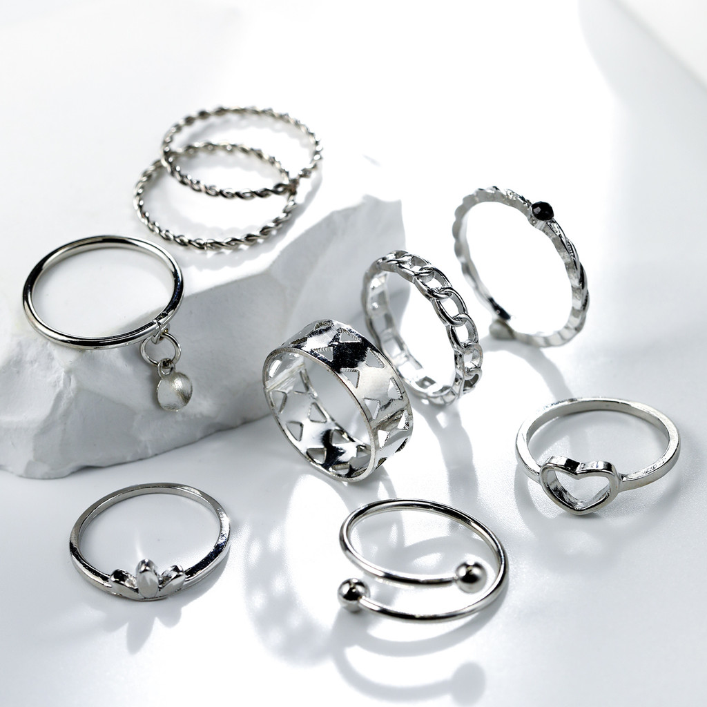 Conjunto de anéis multi-peças banhado a prata vazado amor geométrico feminino anel aberto ajustável multiarticulação