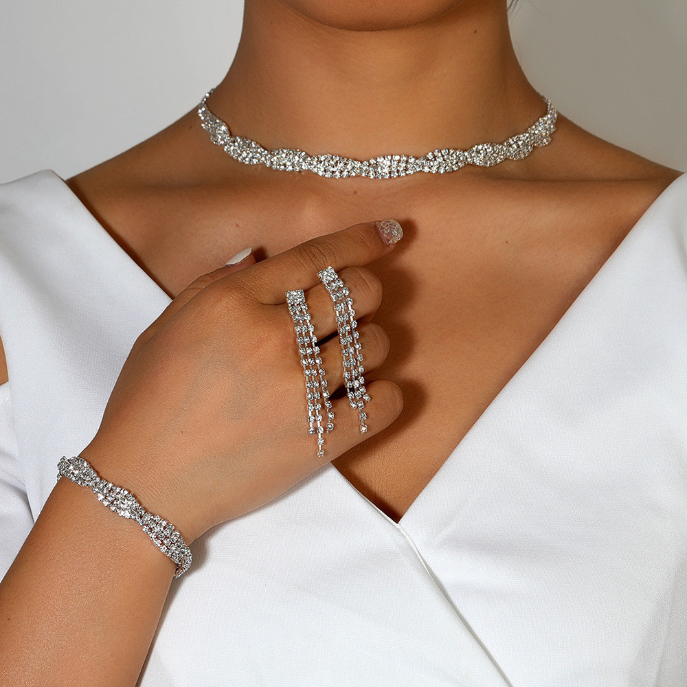 (Conjunto de três peças) Conjunto de brincos e colar com borlas de diamante e strass para mulheres, joias de casamento