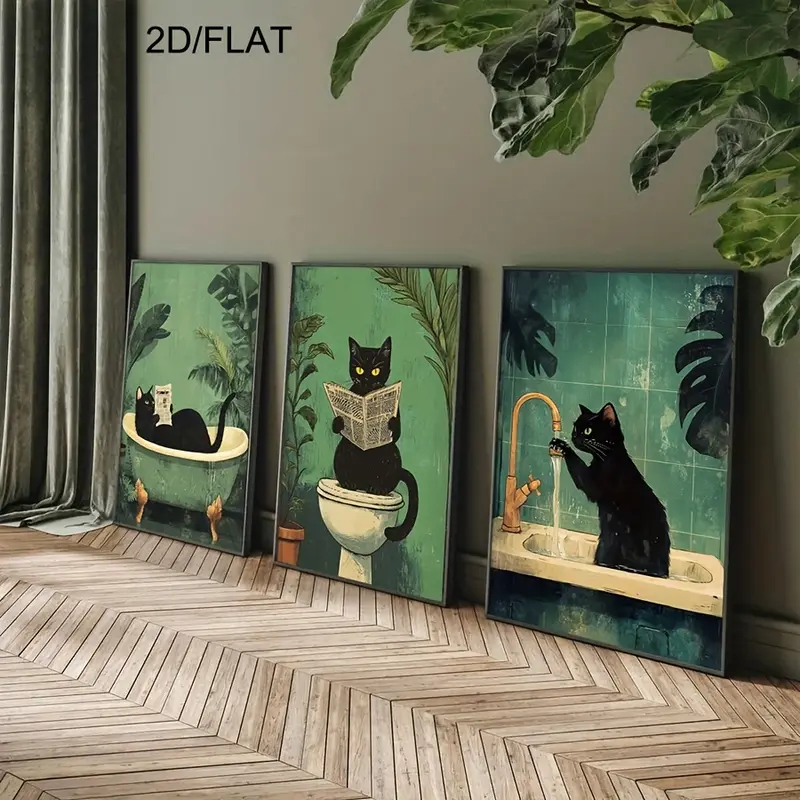 Kit 3 Quadros de Gatos Pretos Engraçados | Decoração Criativa para Banheiro ou Lavabo