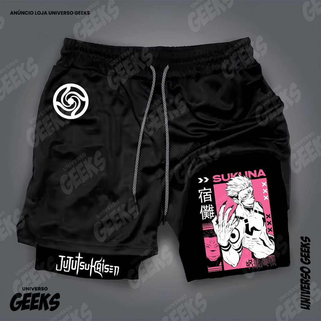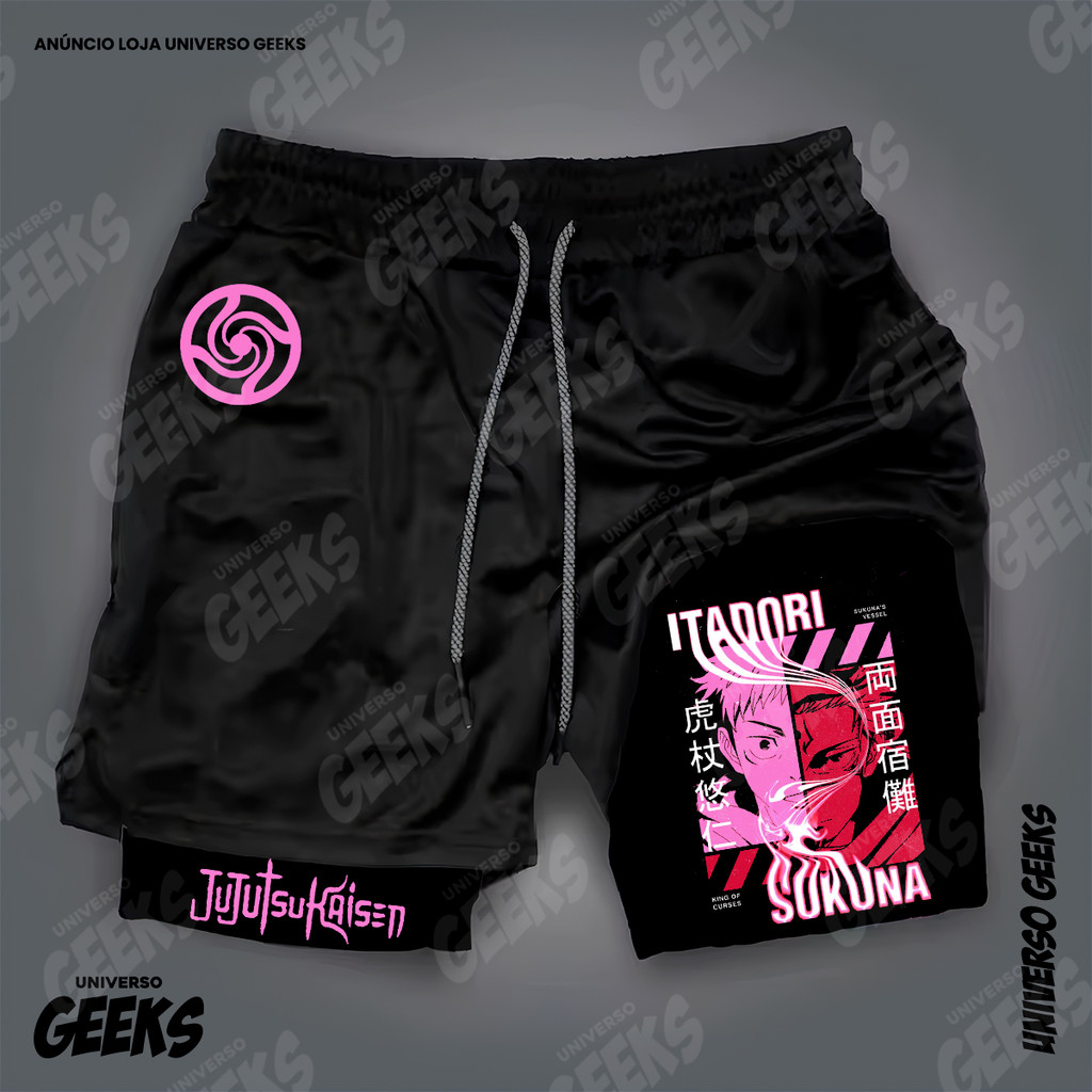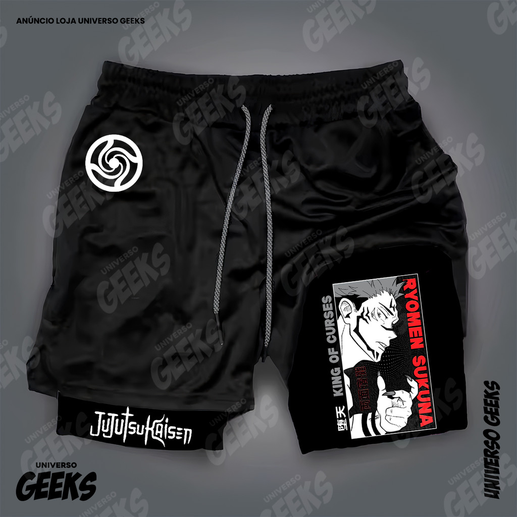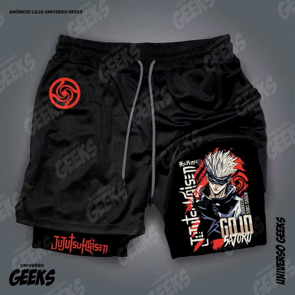 Short 2 em 1 Compressão Dry-Fit Estampado Satoru Gojo Itadori Sukuna Nobara Maki Jujutsu Kaisen Anime Geek Gym Fitness