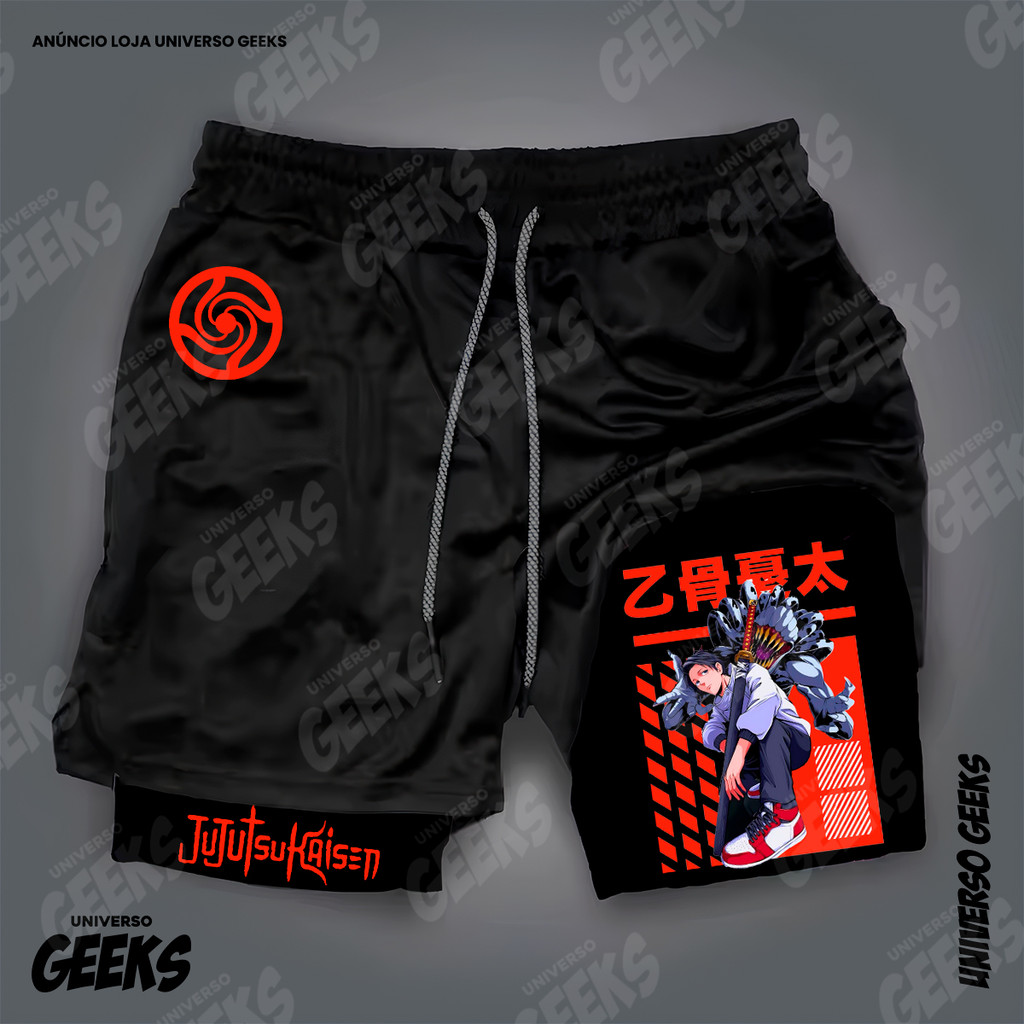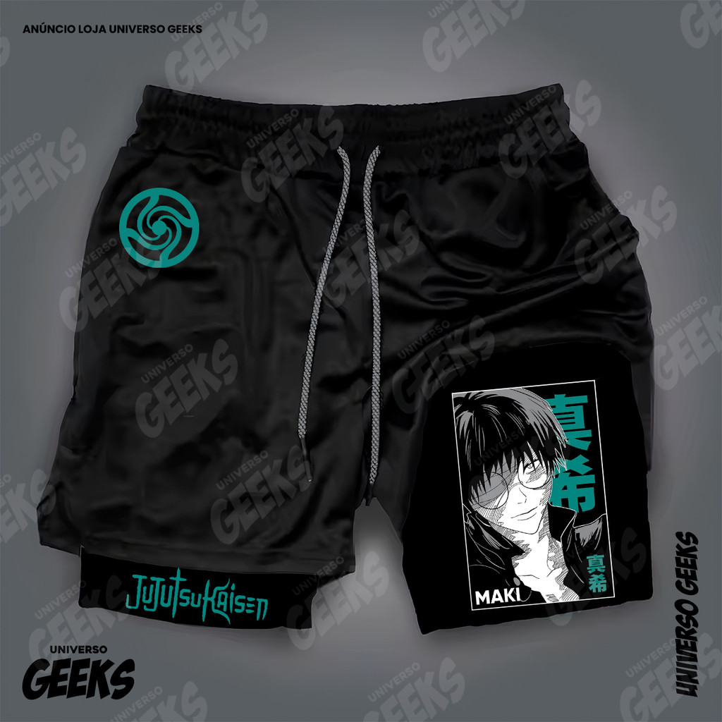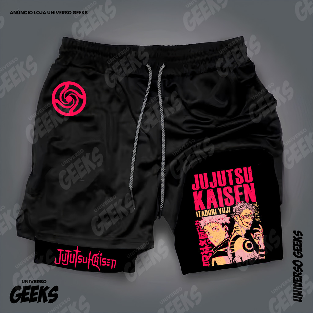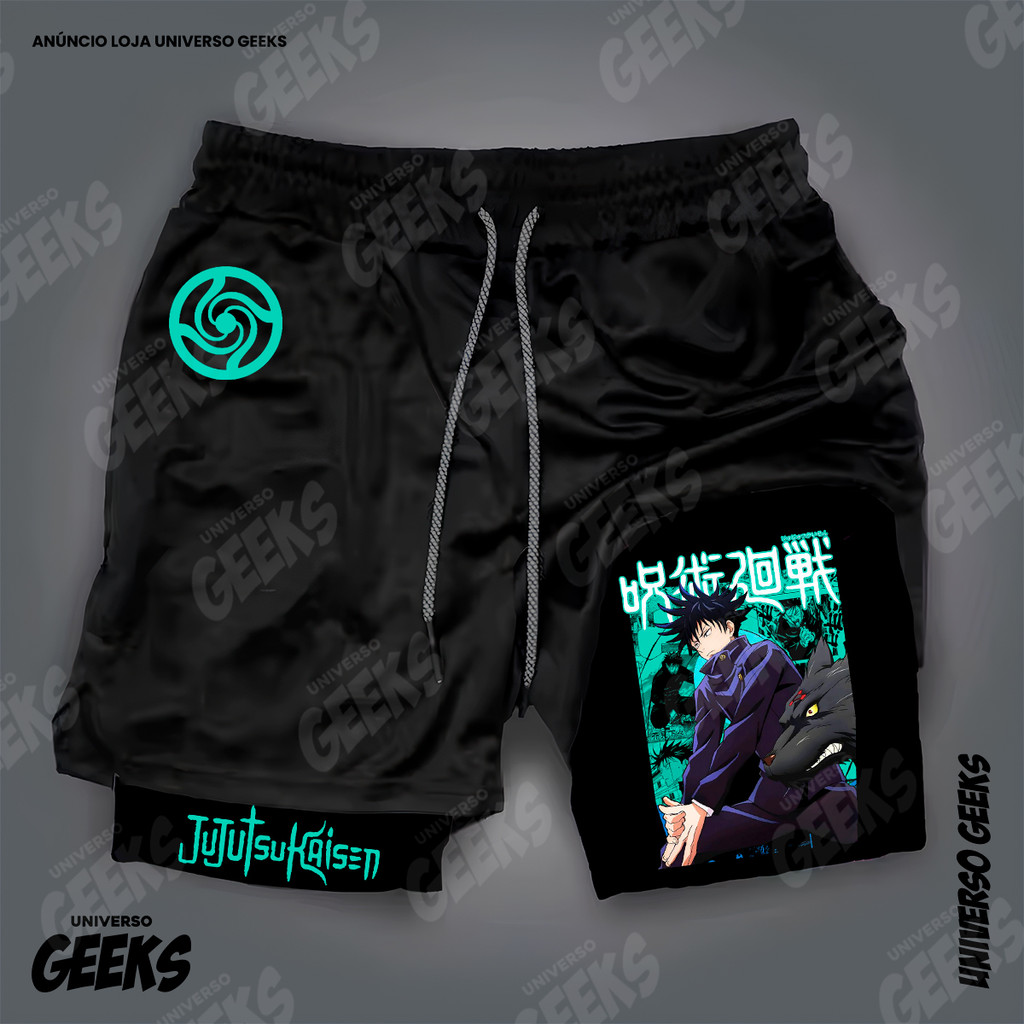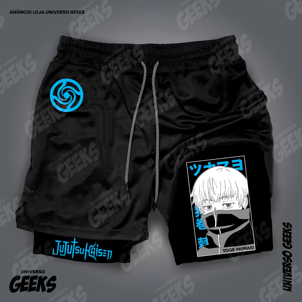 Short 2 em 1 Compressão Dry-Fit Estampado Satoru Gojo Itadori Sukuna Nobara Maki Jujutsu Kaisen Anime Geek Gym Fitness