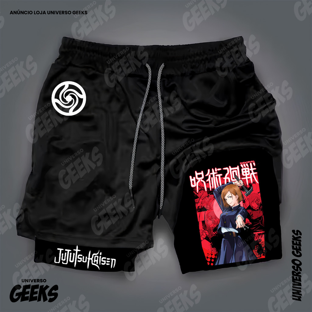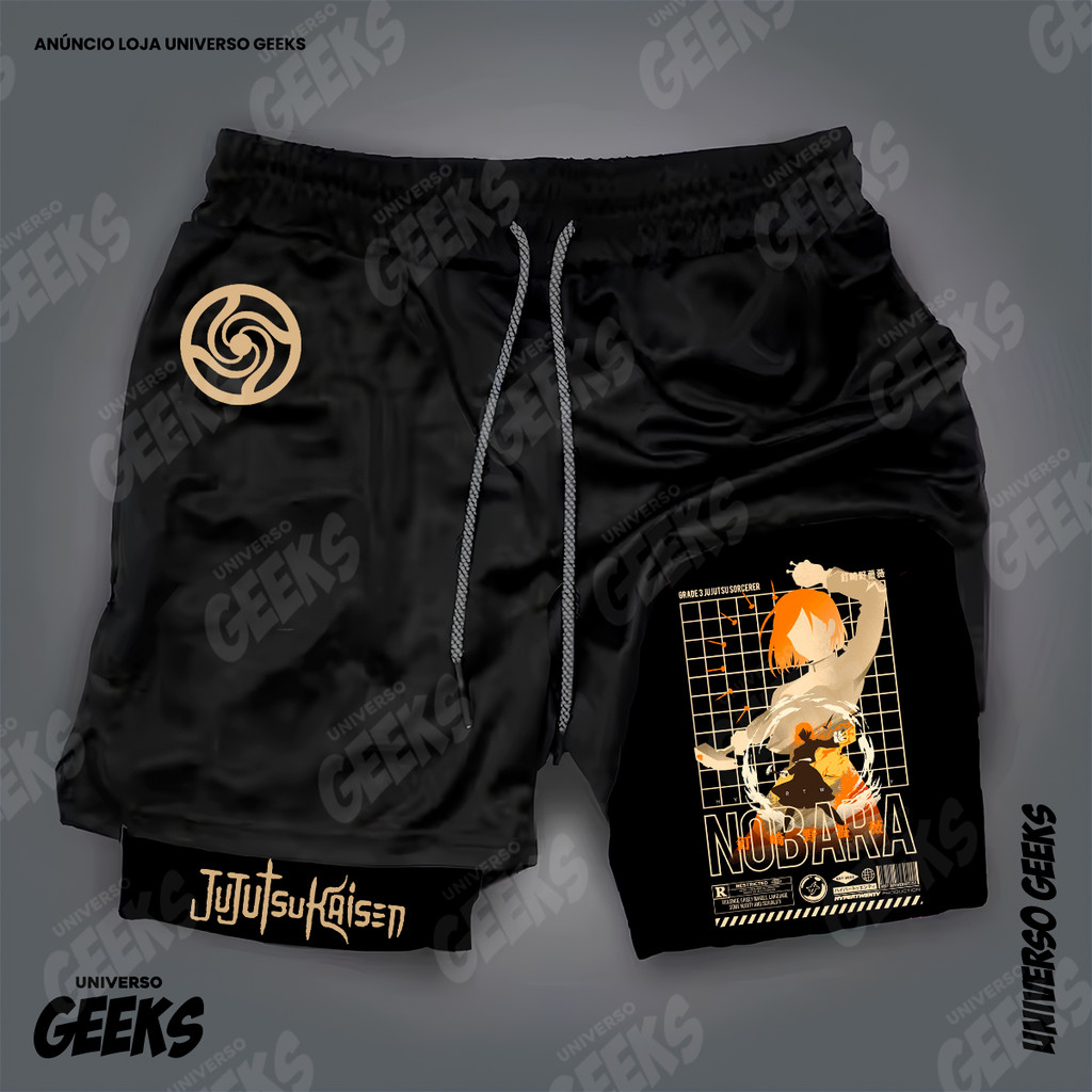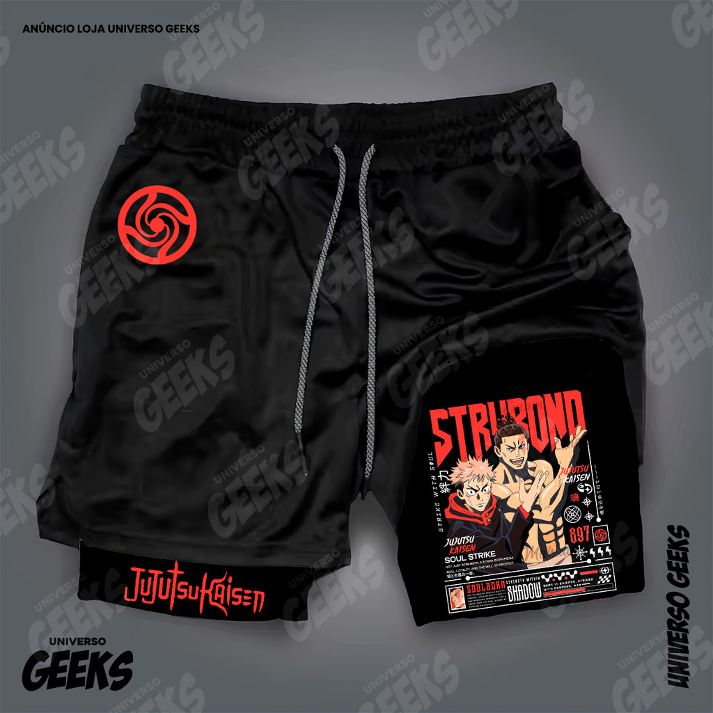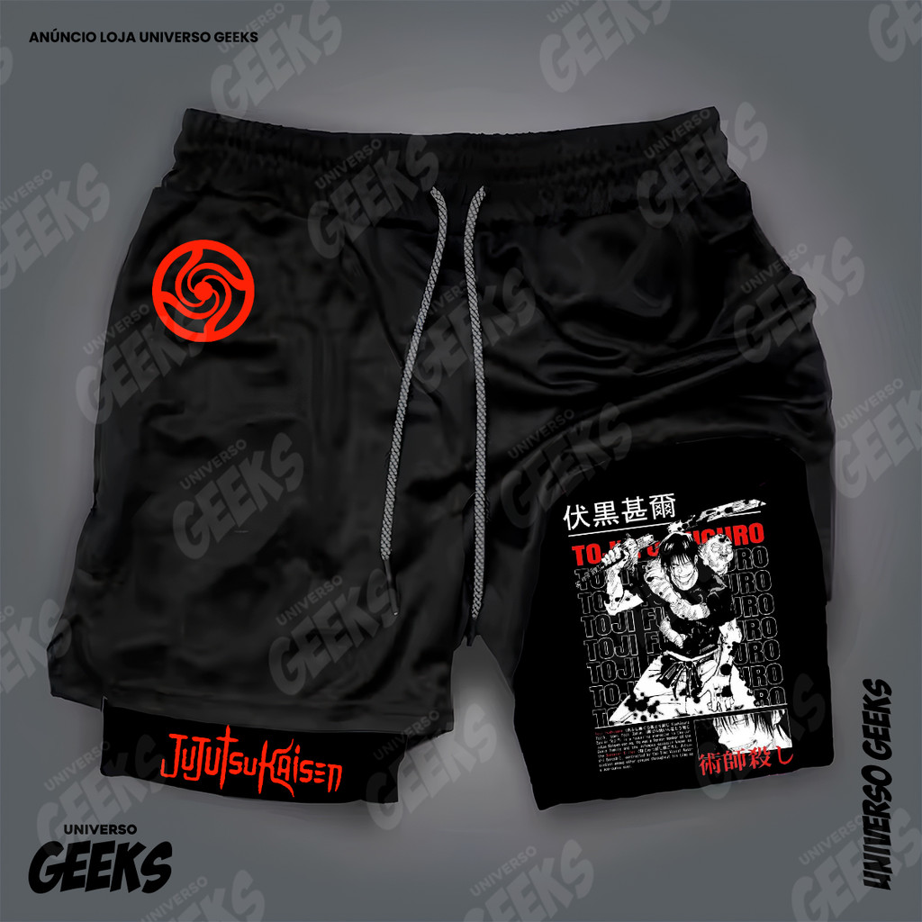 Short 2 em 1 Compressão Dry-Fit Estampado Satoru Gojo Itadori Sukuna Nobara Maki Jujutsu Kaisen Anime Geek Gym Fitness