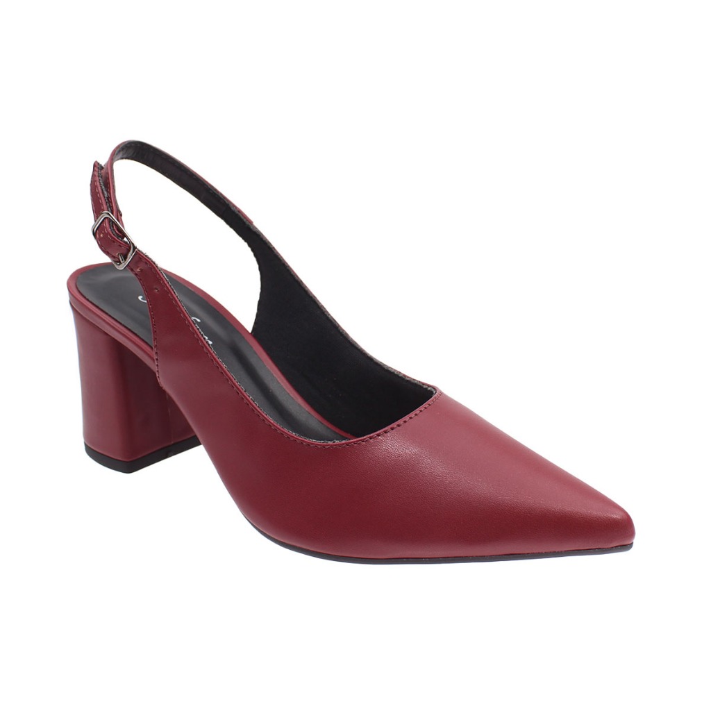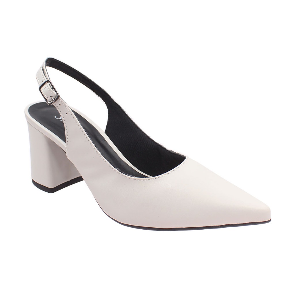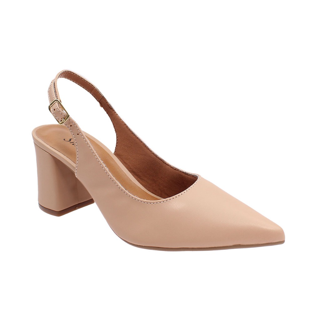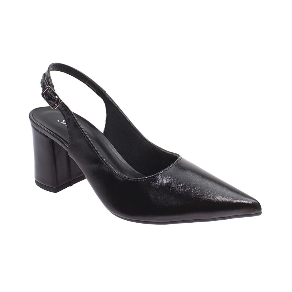 Scarpin Feminino Bico Fino SlingBack Abotoar Tira Atrás Salto Alto Bloco 7cm Social Macio Liso