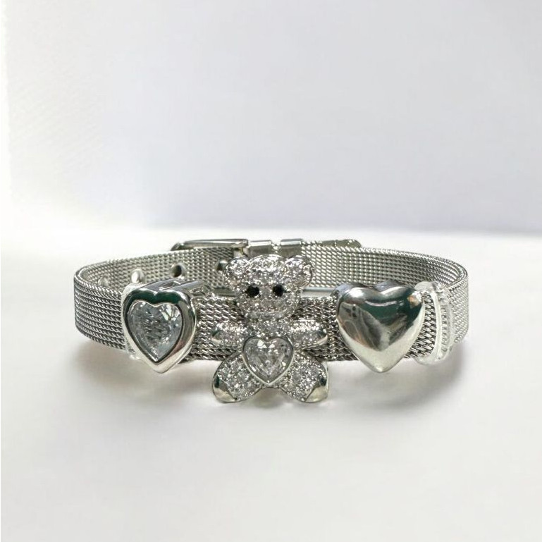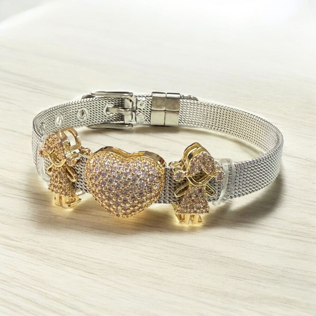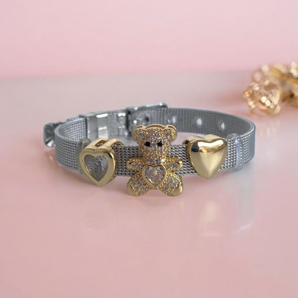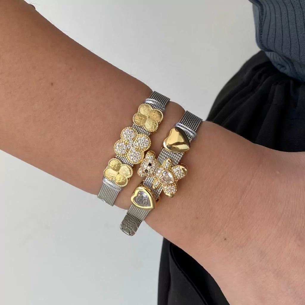 Pulseira malha Aço Feminina + 3 Charms Moda Mulher Elegante Pulseira Relógio