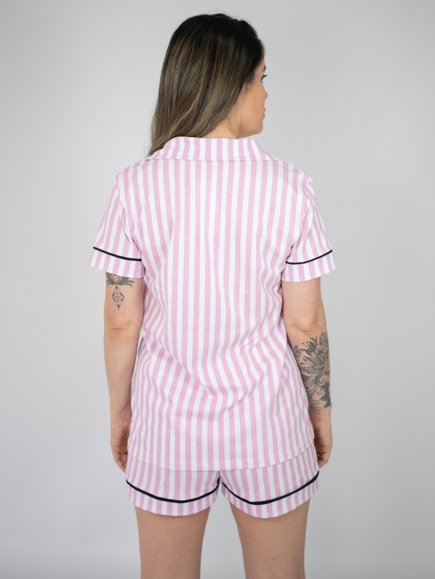 Pijama Feminino Americano Manga Curta Botões Frente Algodão Verão Amamentação - Listrado Rosa