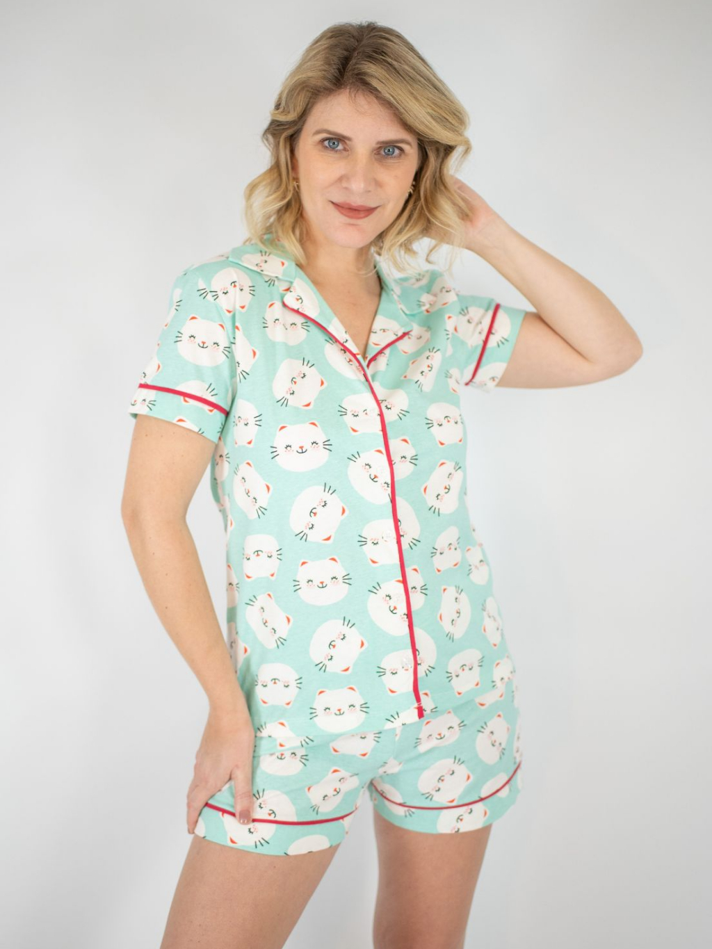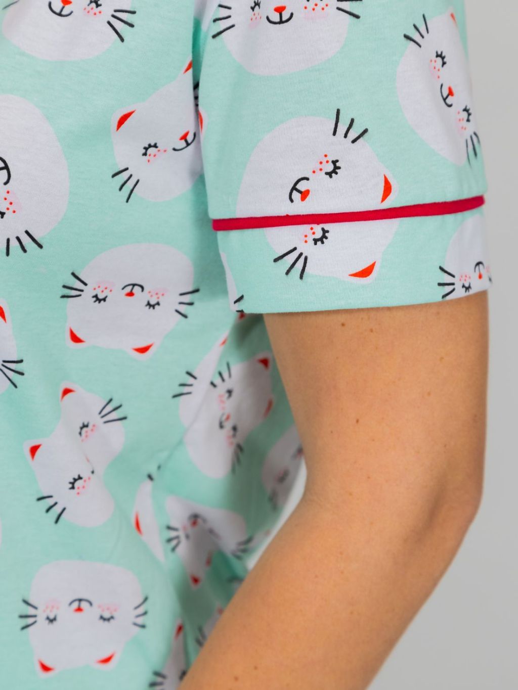 Pijama Feminino Americano Manga Curta Botões Frente Algodão Pós-Cirúrgico Amamentação-Gatinhos Verde