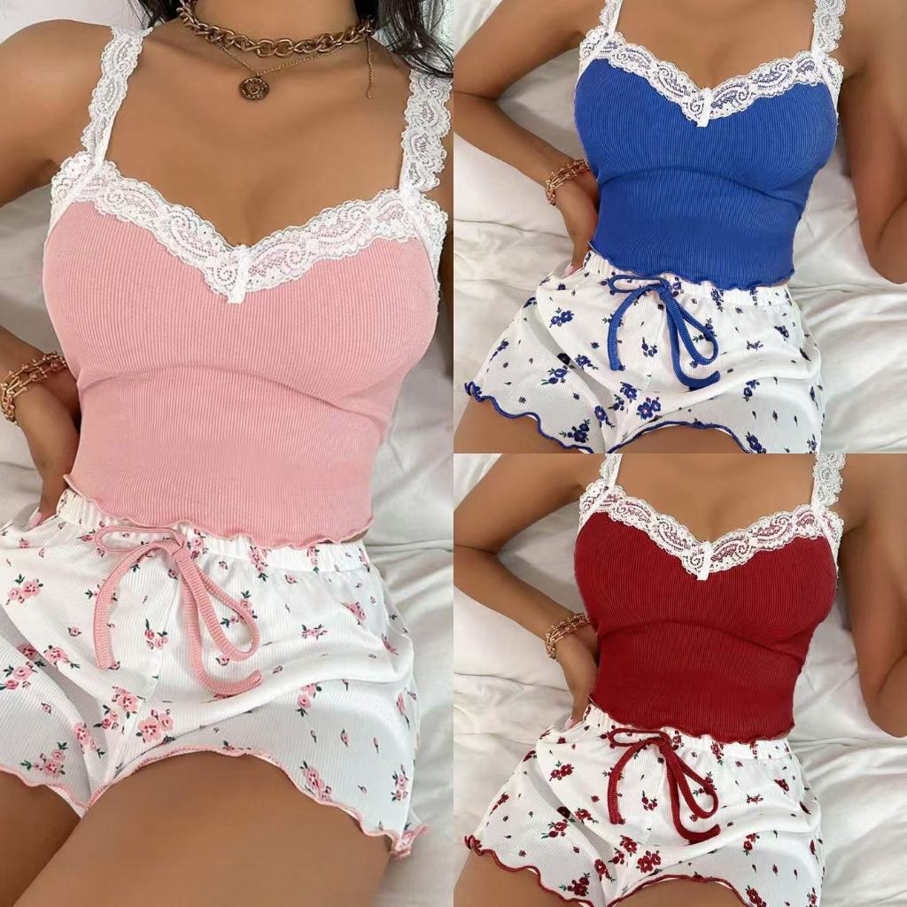 Pijama Feminino Veräo Sexy Renda Malha Fria Terno de 2 Peças Para Casa