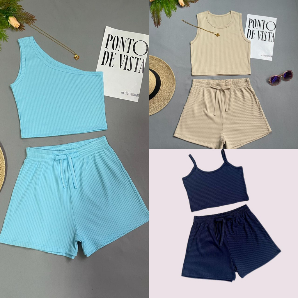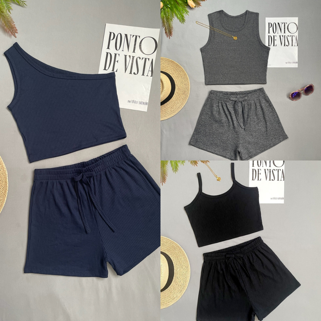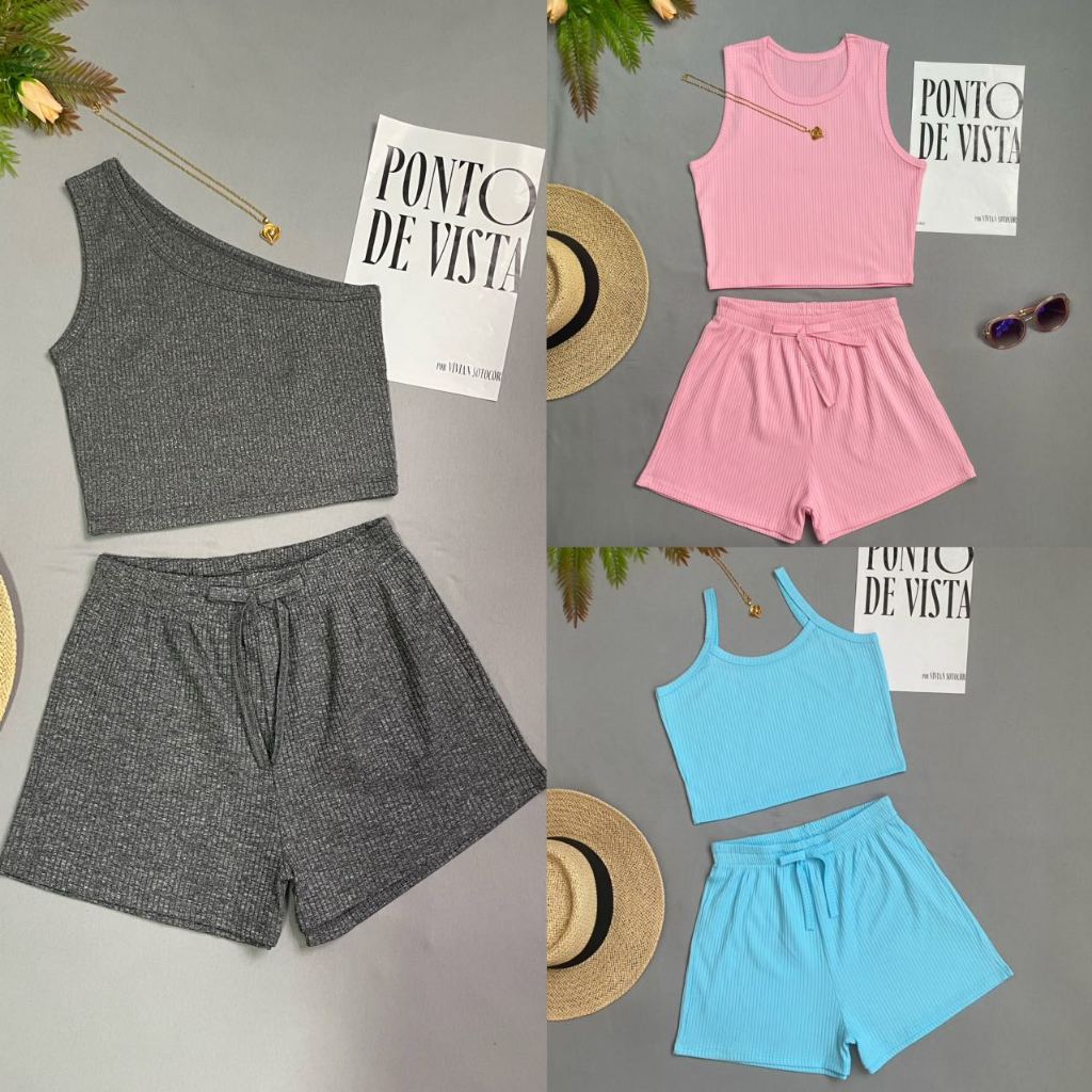 KIT3 Conjunto Feminino Casual – Top Cropped + Shorts – Cores Variadas