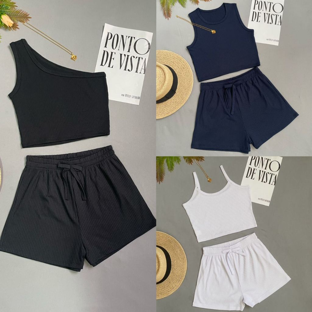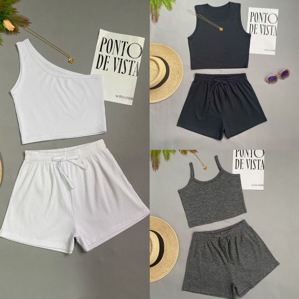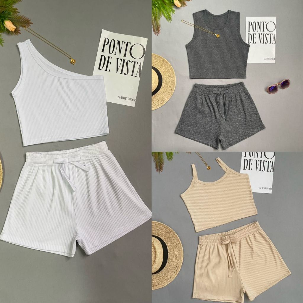 KIT3 Conjunto Feminino Casual – Top Cropped + Shorts – Cores Variadas