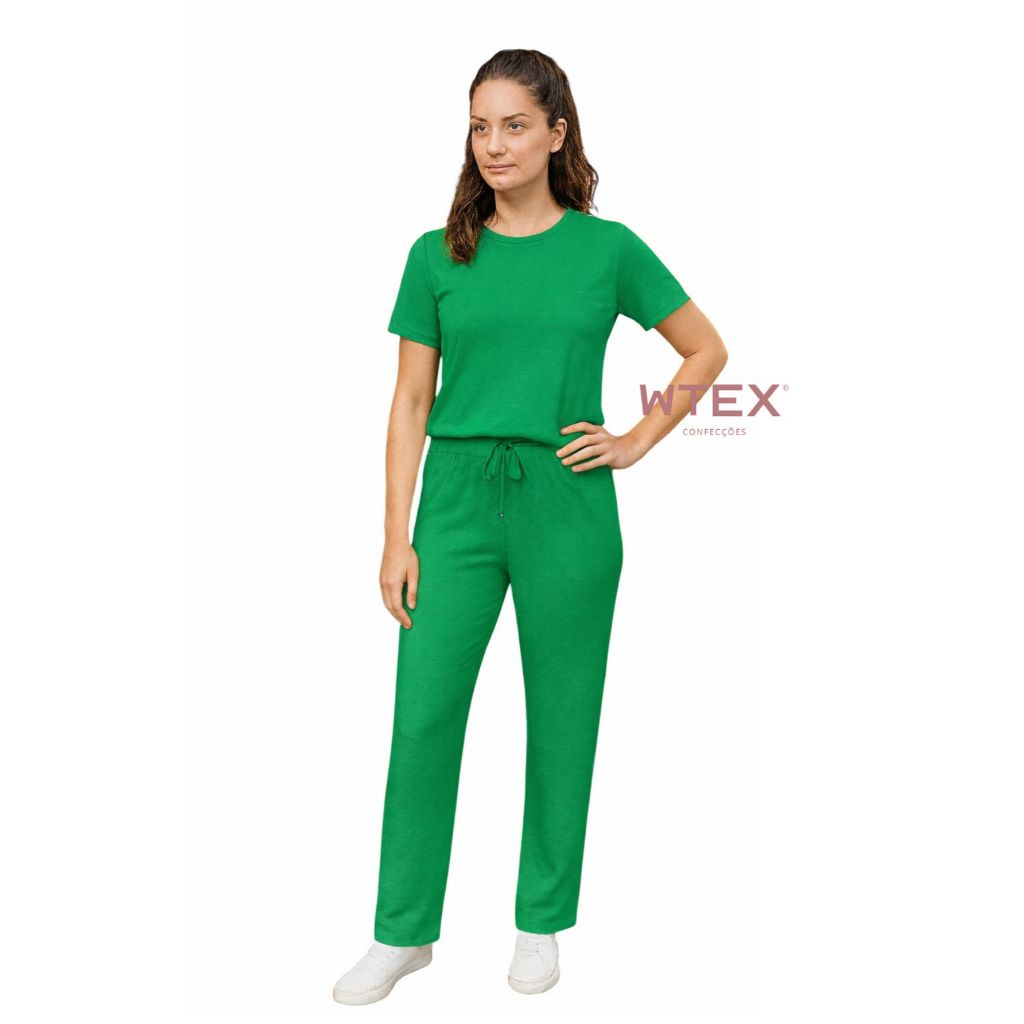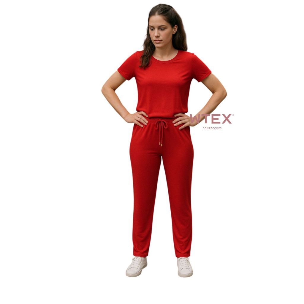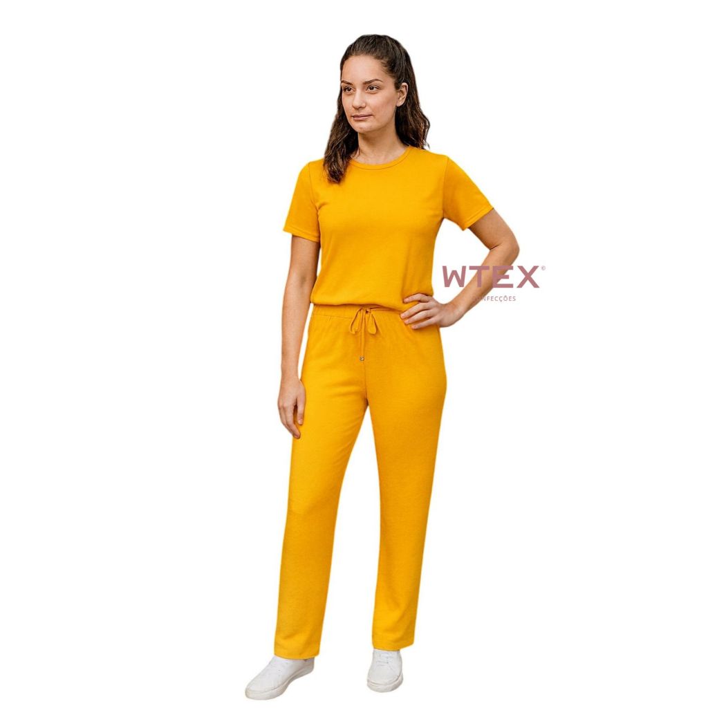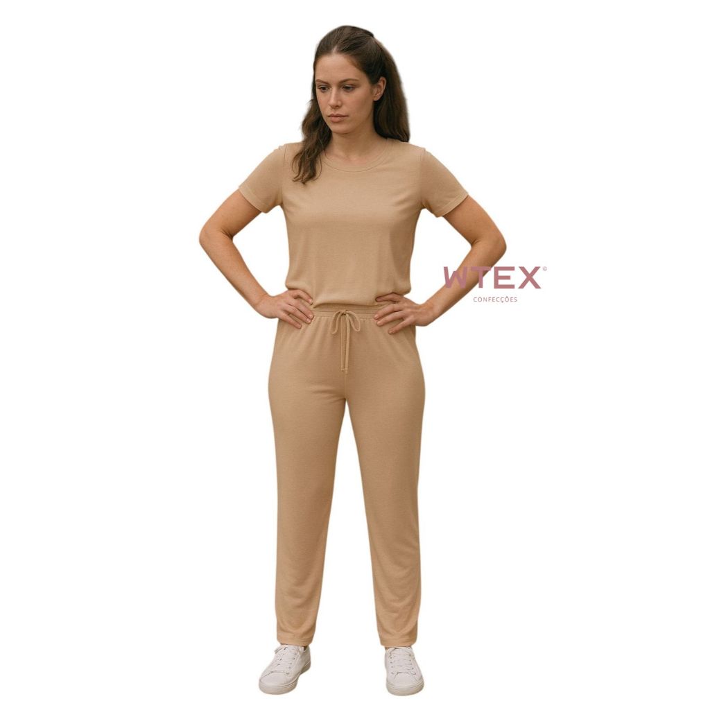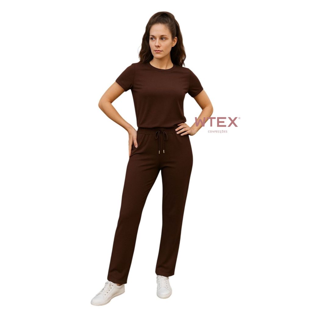 Conjunto Feminino VISCOLYCRA Malha Comfy Blusa Camiseta Manga Curta e Calça Pantalona Cintura Alta