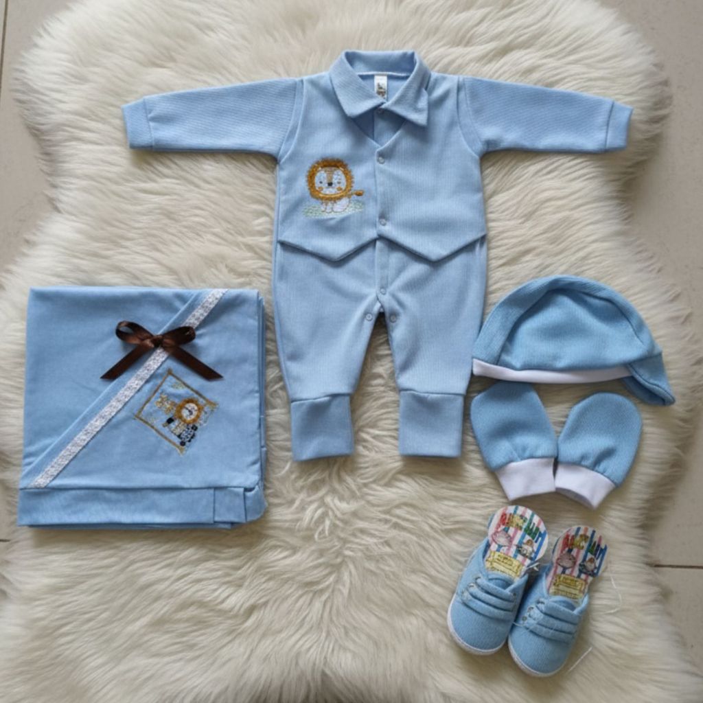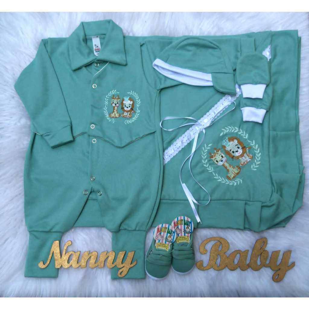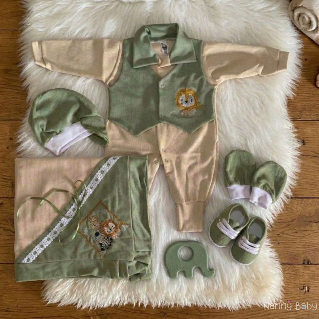 Saída Maternidade Masculino Luxo I Kit Completo 6 peças tamanho RN I Bordado Safari I 100% Algodão