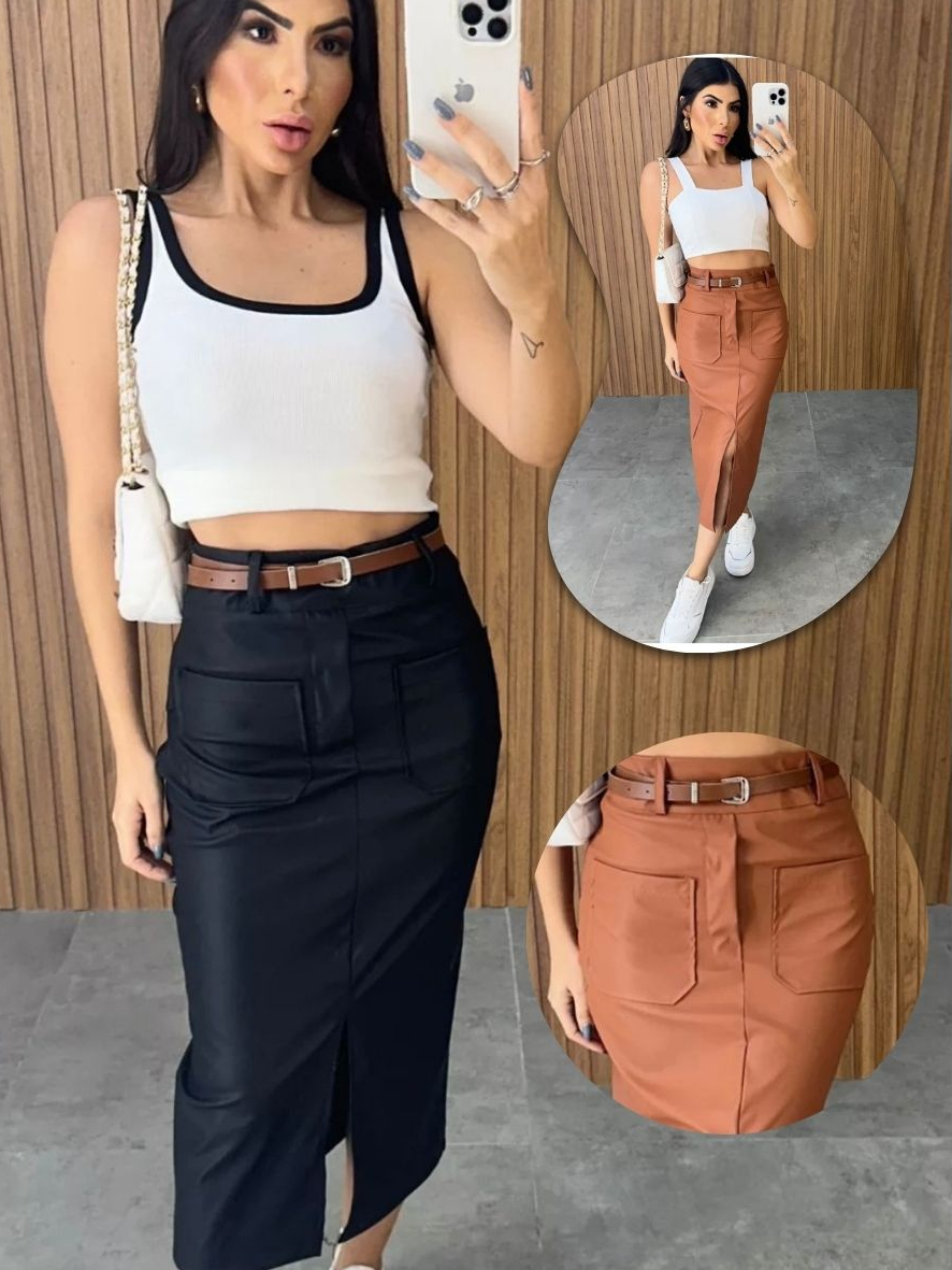 saia midi couro ecologico com bolso na frente