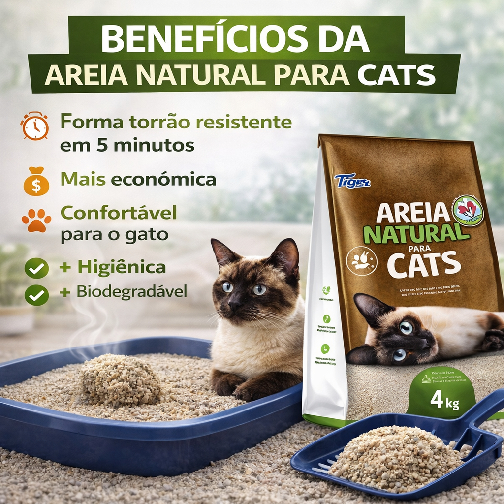 Areia Higiênica Natural Biodegradável Gatos Tiger Cats 4kg evita o desperdicio, maior rendimento, sem poeira