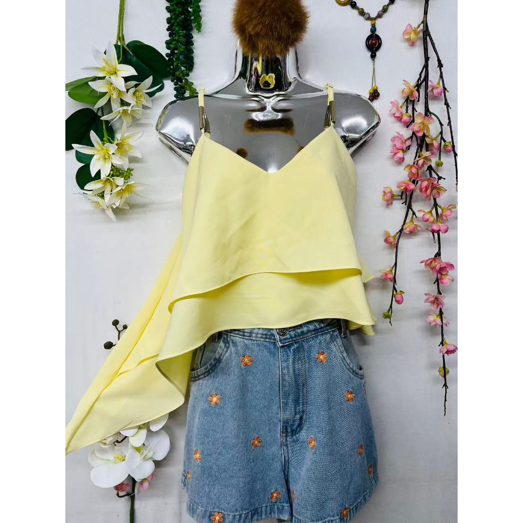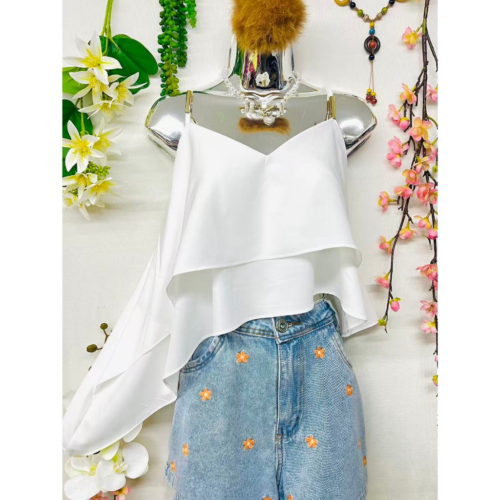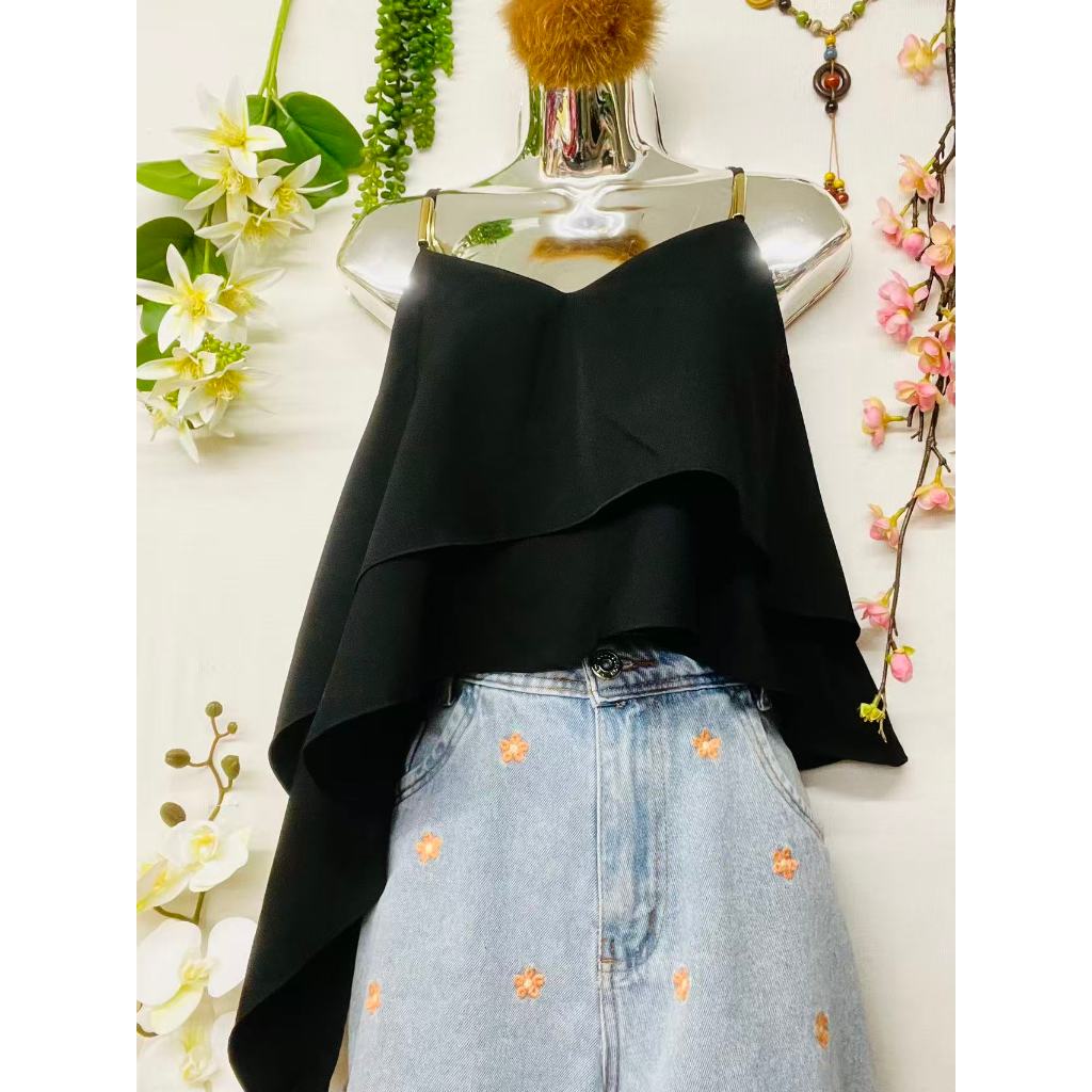 T123 Top de alcinha com babado duplo, silhueta assimétrica super fashion!