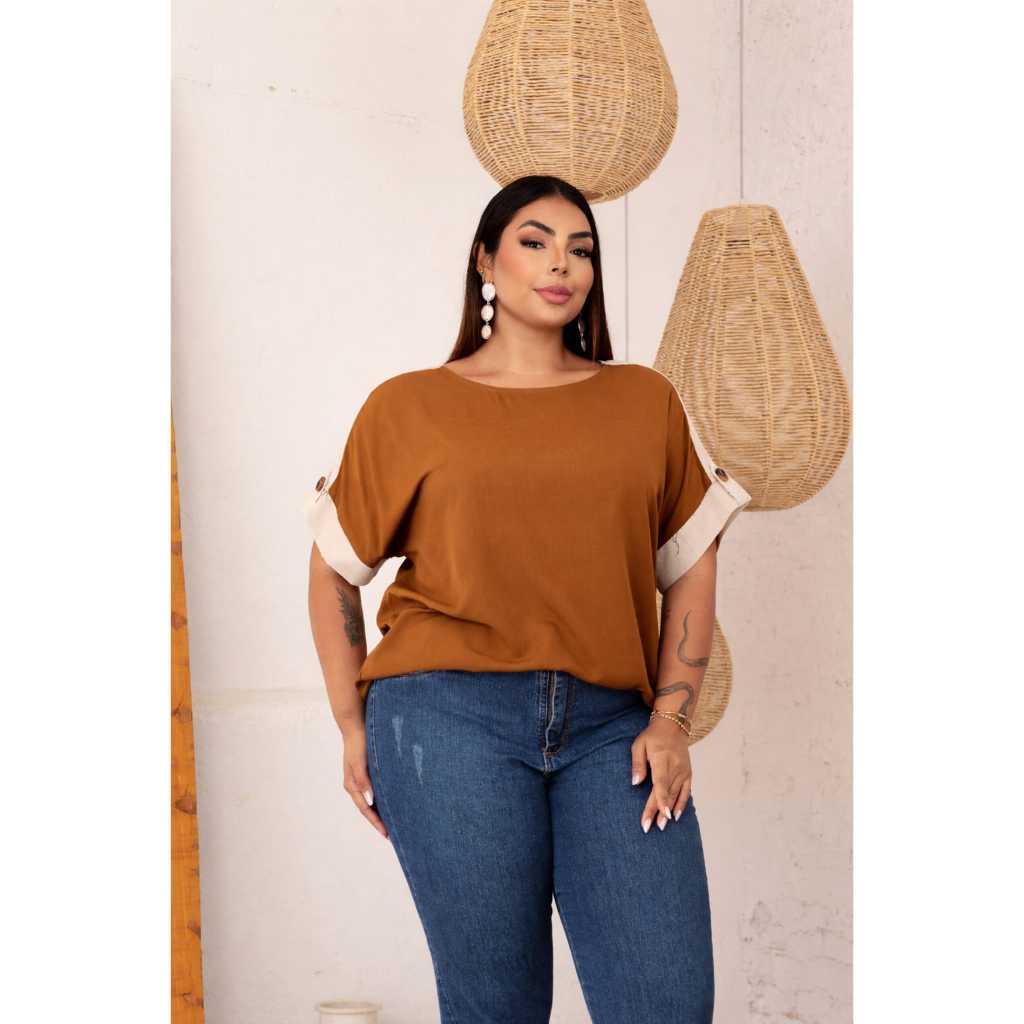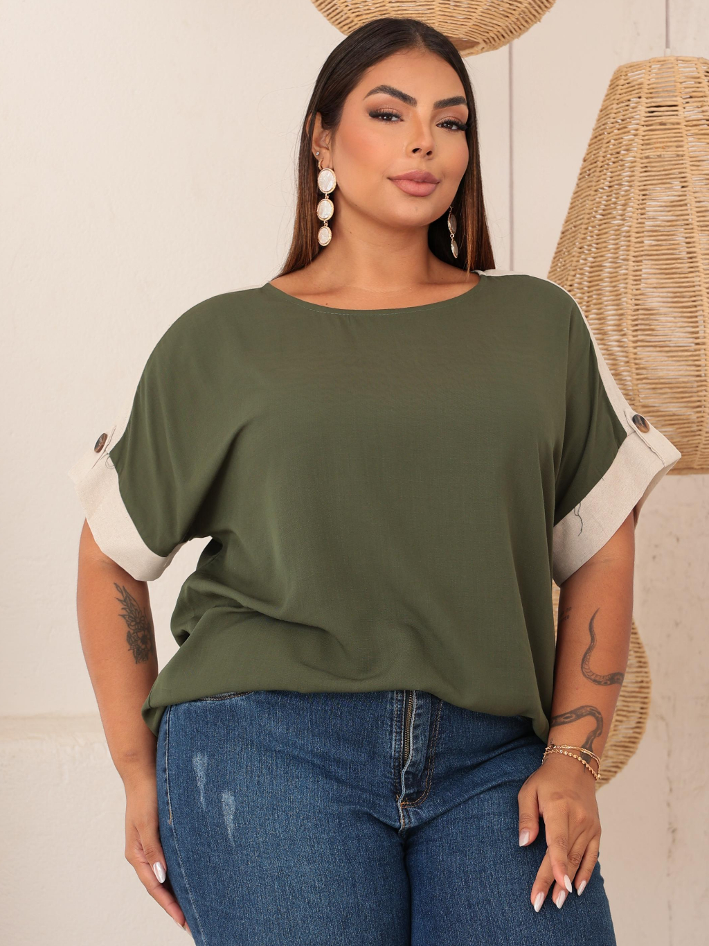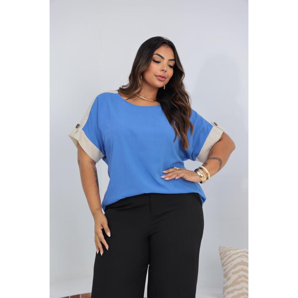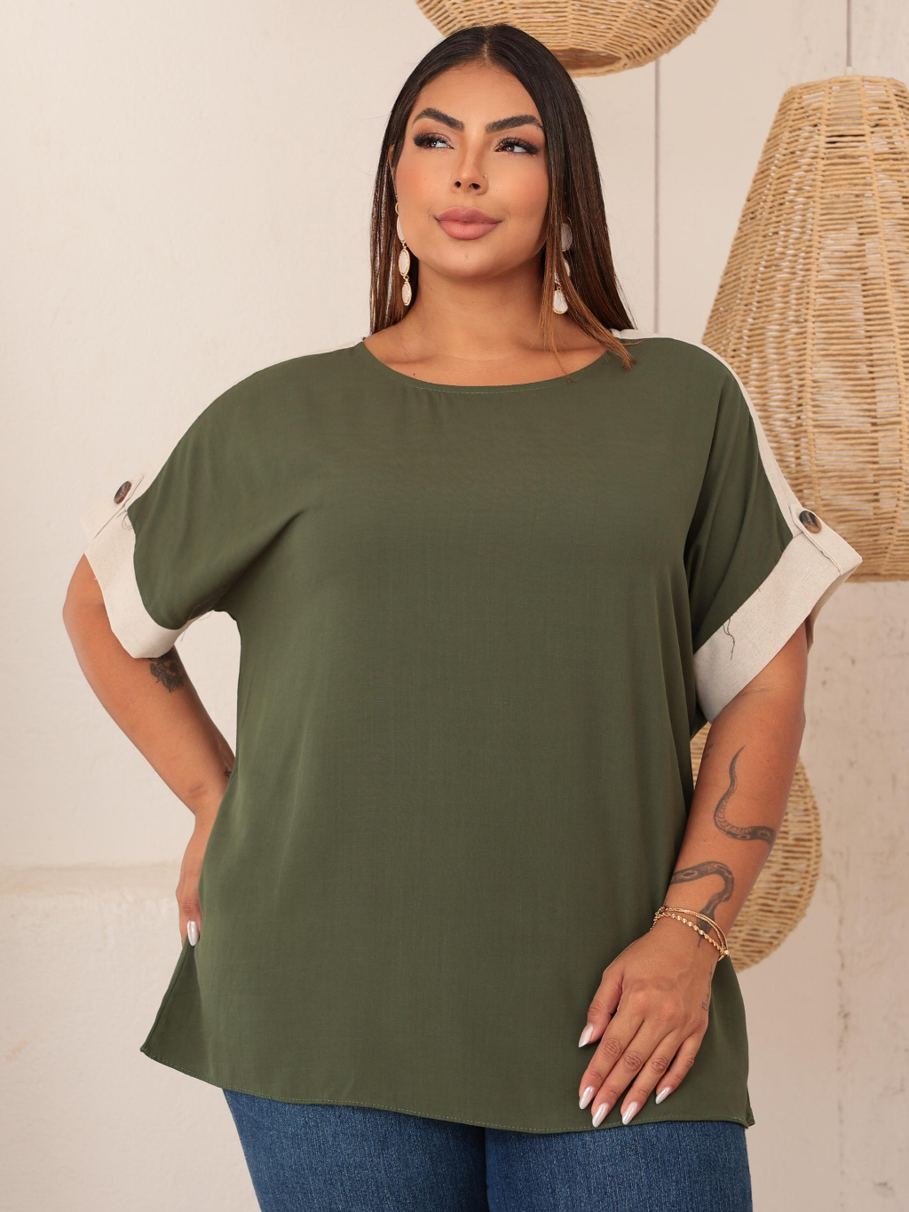 Blusa Feminina Plus Size Viscolinho com Linho no Ombro e Manga de Botão Social Casual Chic G1 G2 G3