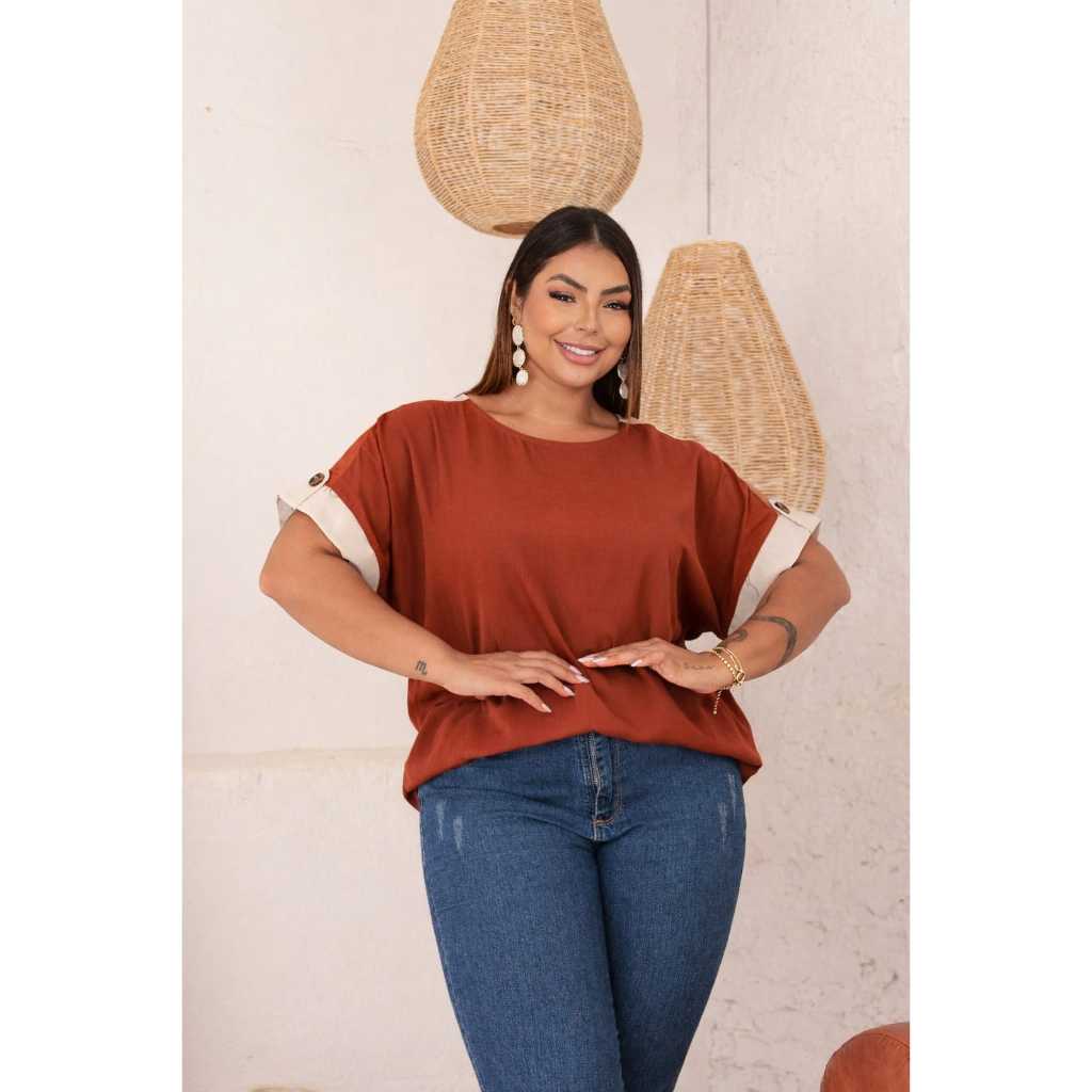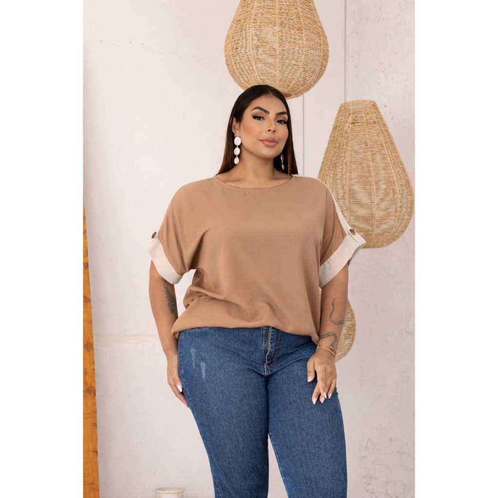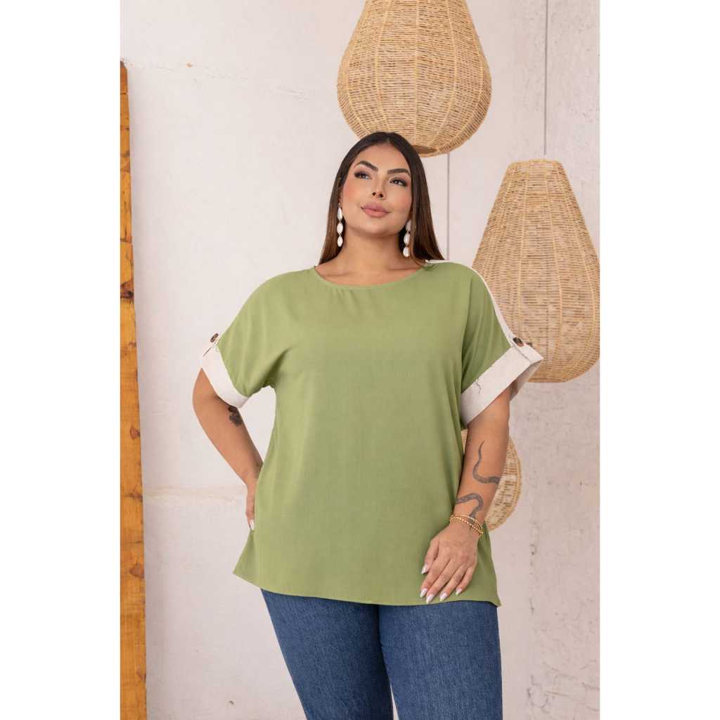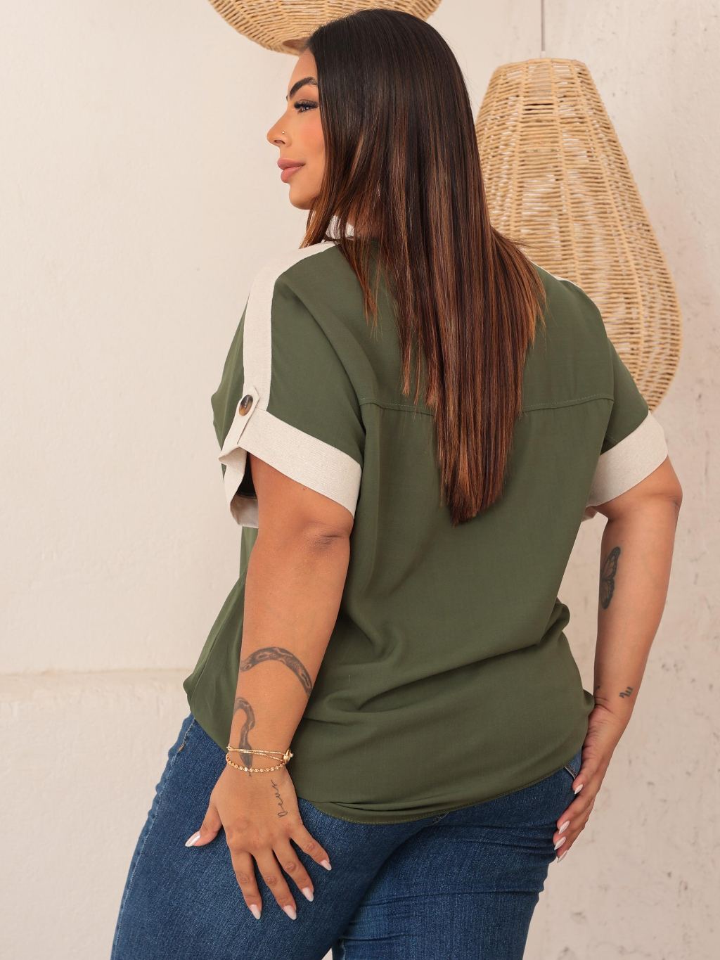 Blusa Feminina Plus Size Viscolinho com Linho no Ombro e Manga de Botão Social Casual Chic G1 G2 G3