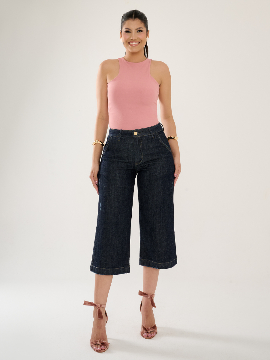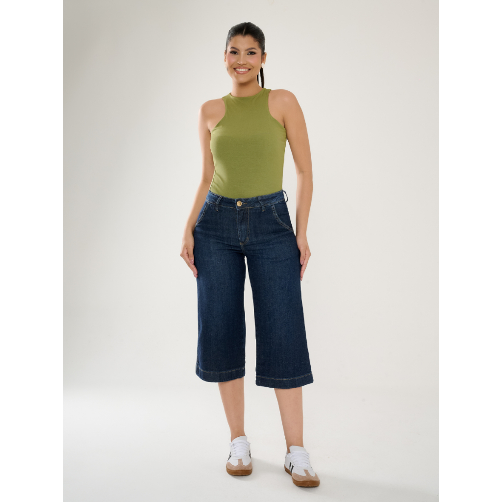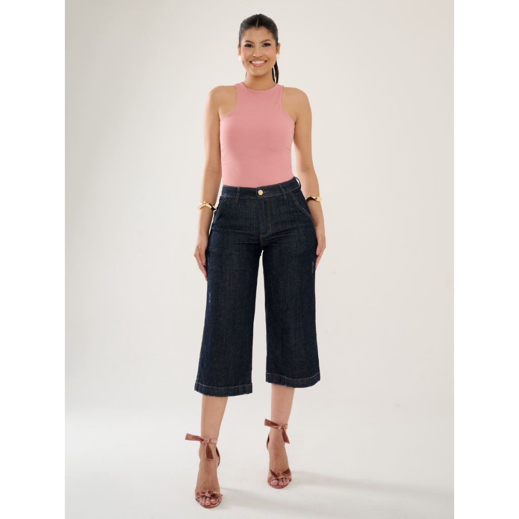 Calça Jeans Feminina Pantacourt Alfaiataria Lycra Sem Fenda Com Elastano Cos Alto Confortável Calor