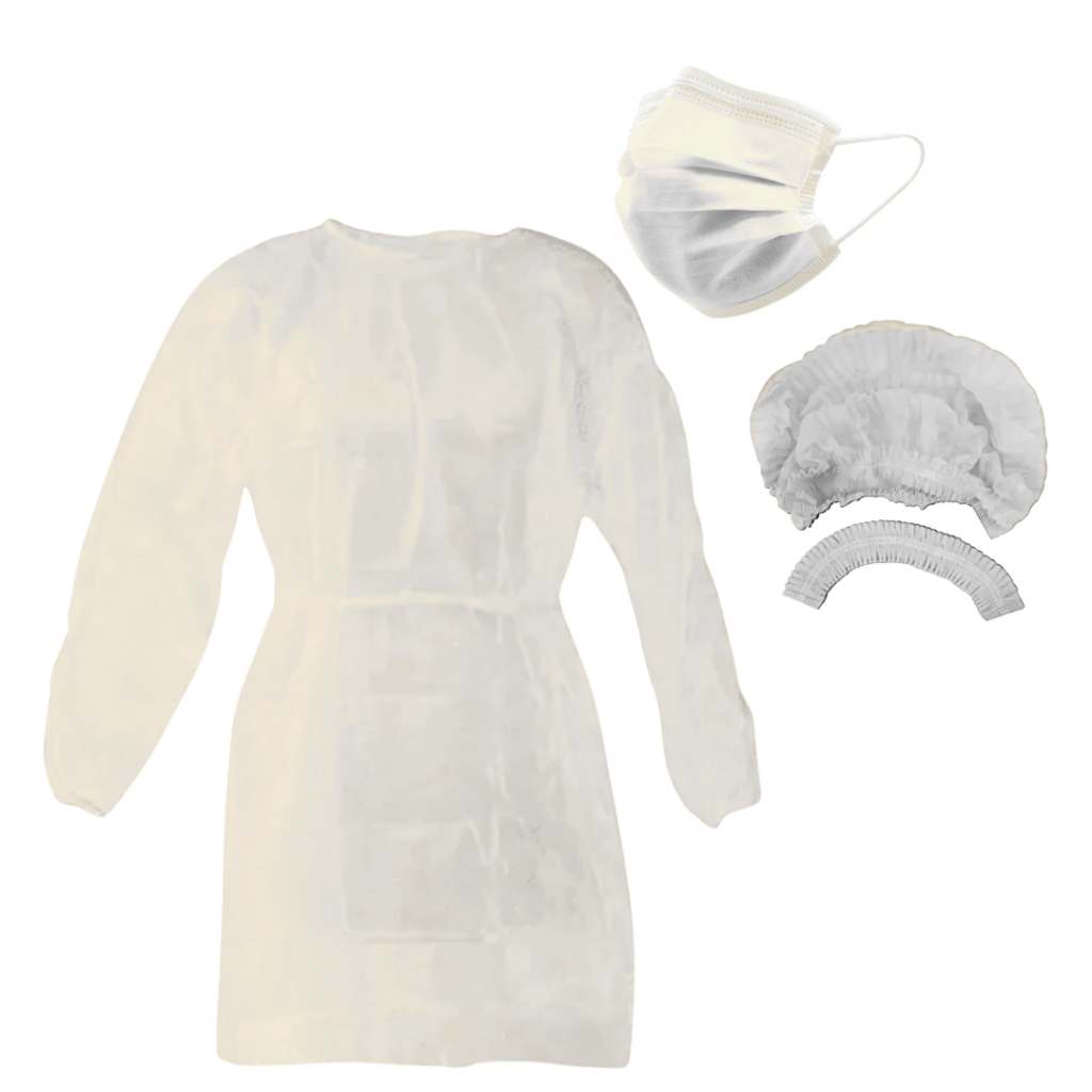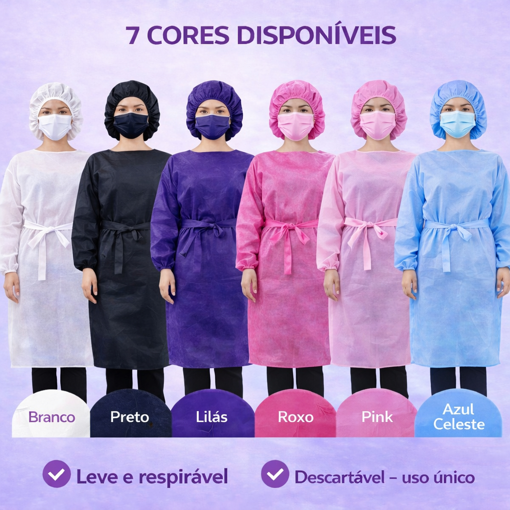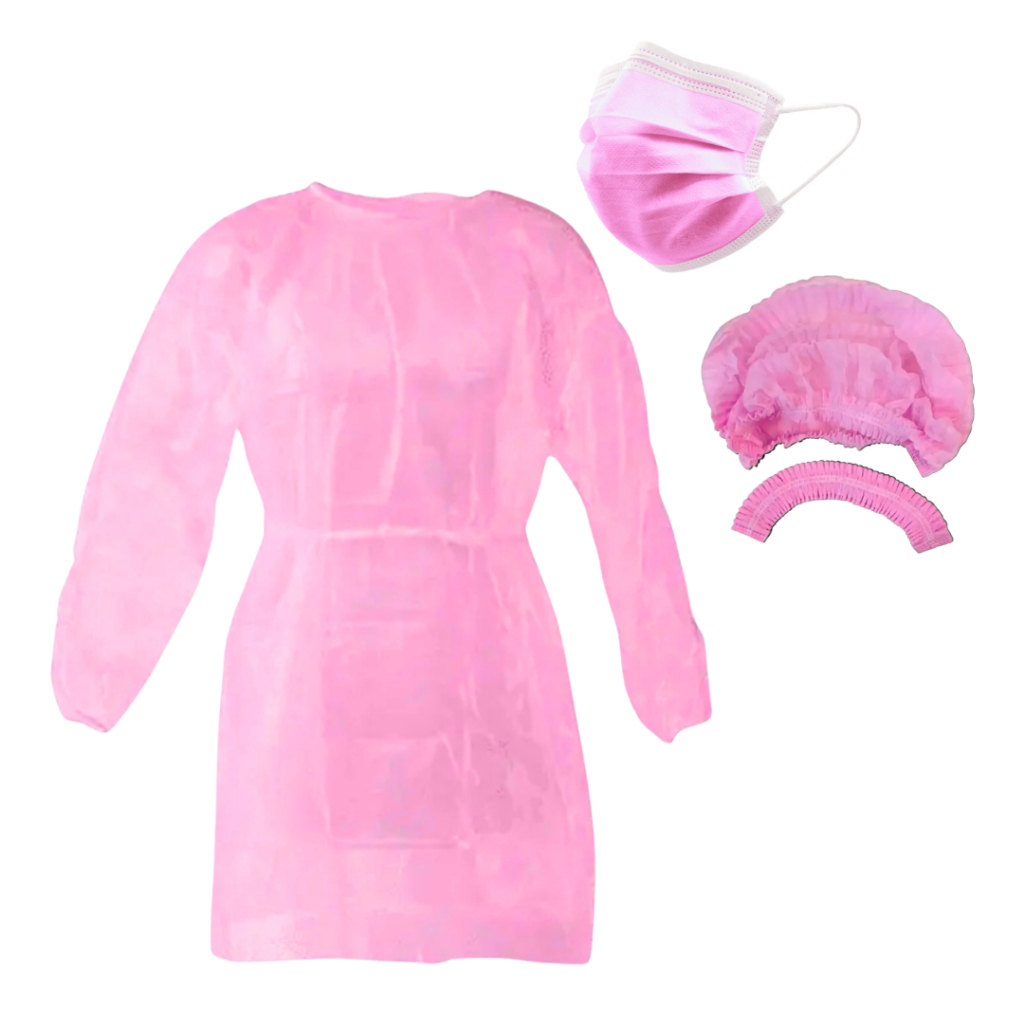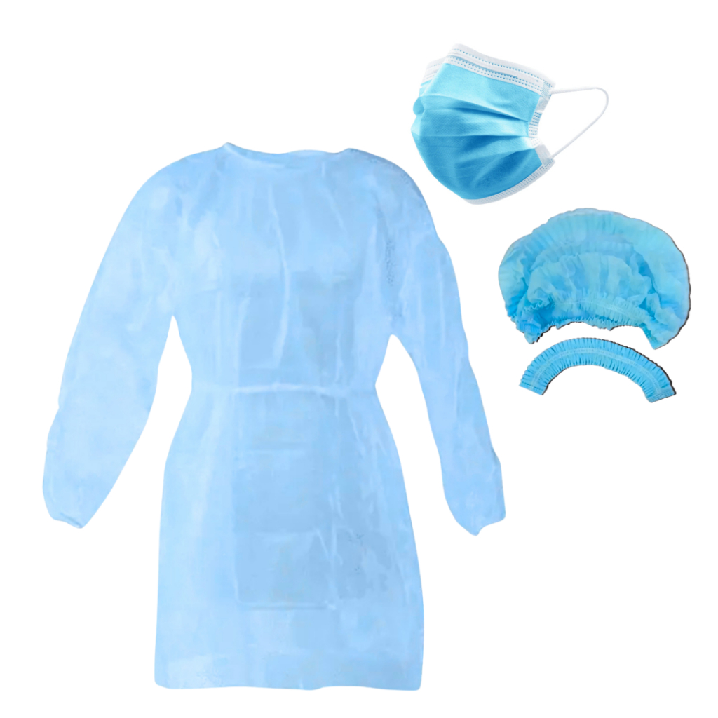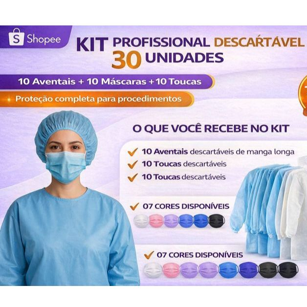 (Kit 30) 10 Touca 10 Máscara 10 Avental Manga Longa Descartáveis Profissional