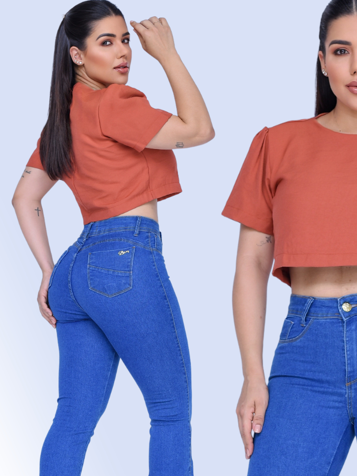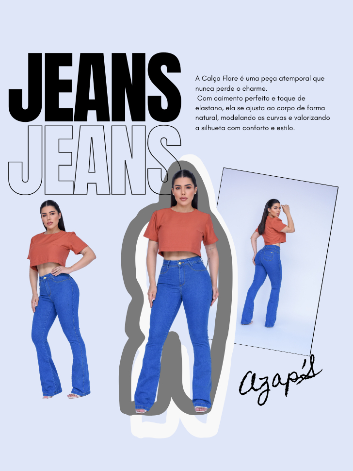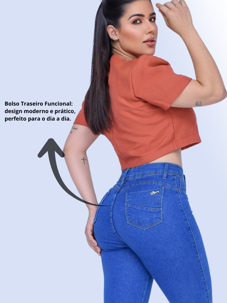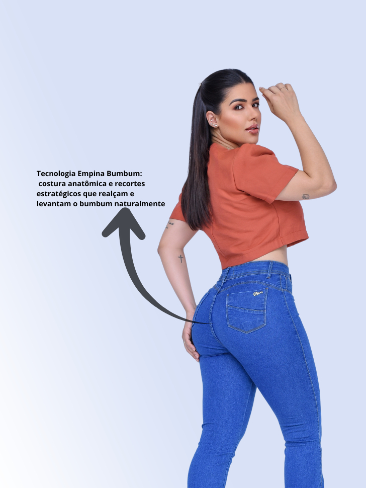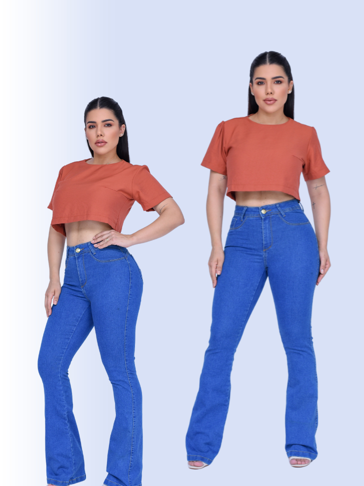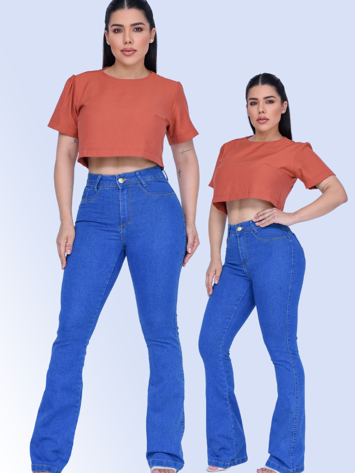 Calca Jeans feminina Modeladora Cintura Alta Flare Boca de Sino Elegante com Elastano