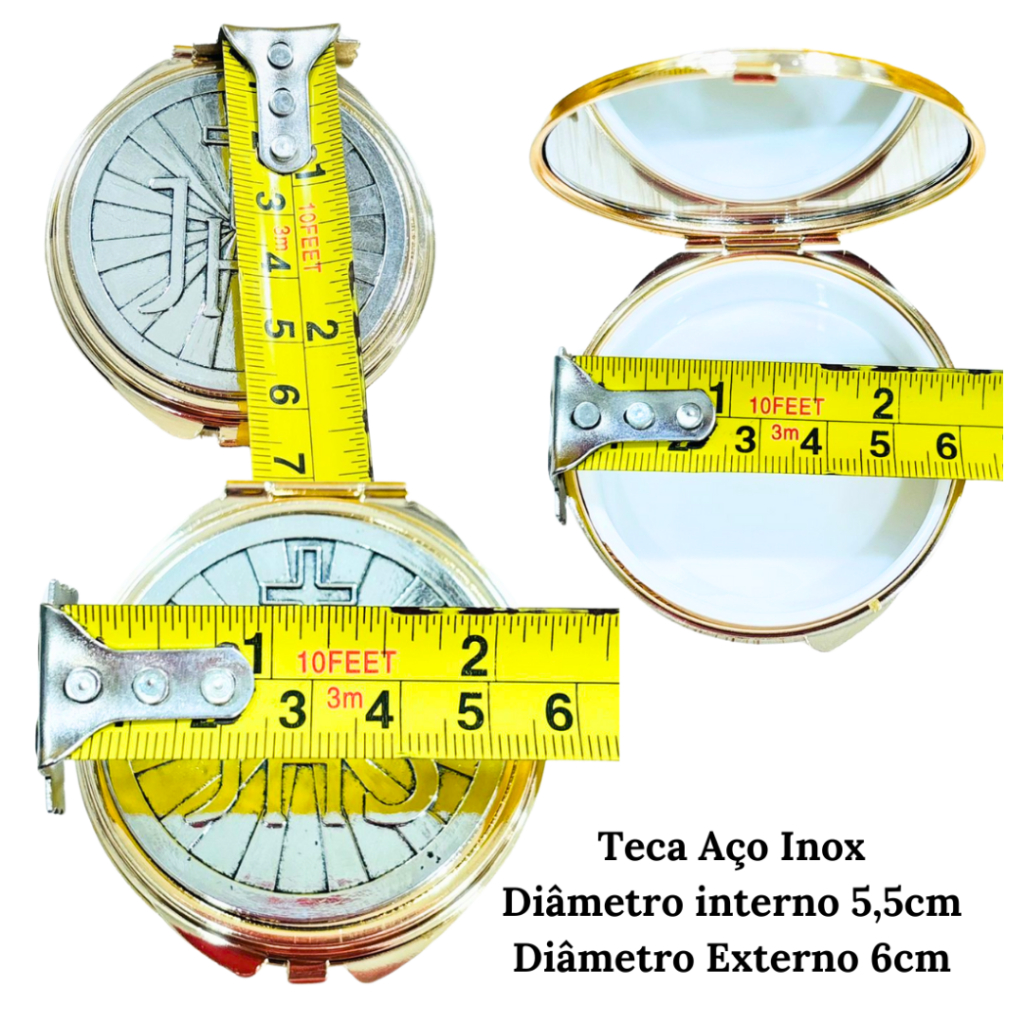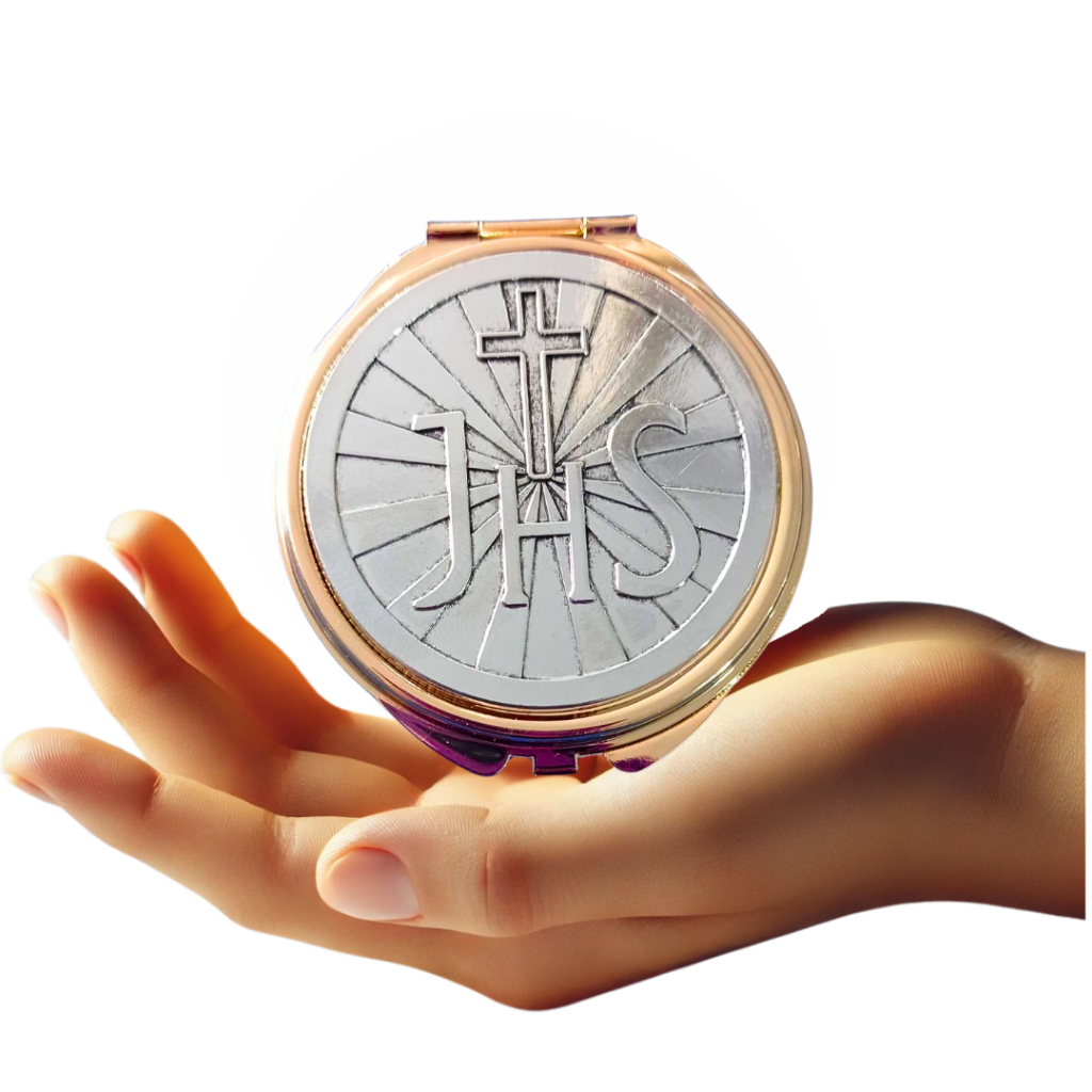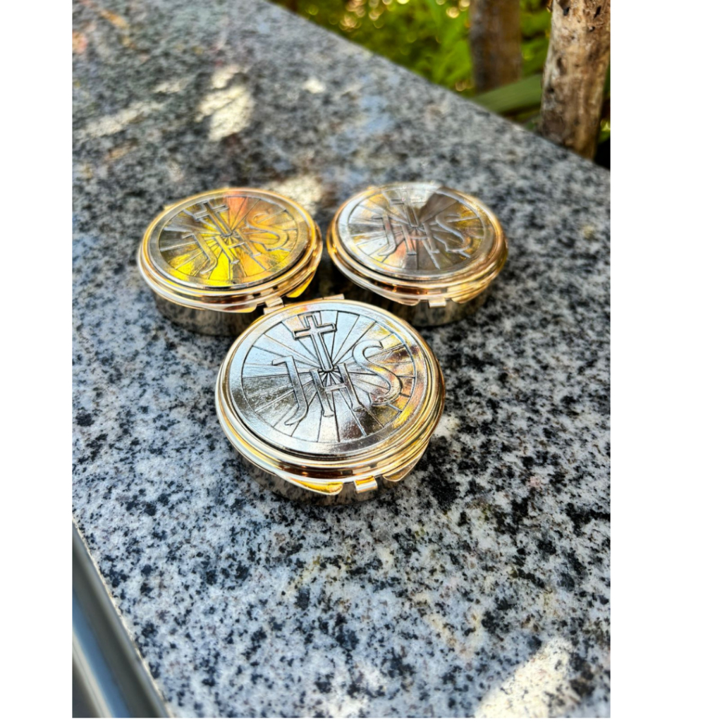 Teca Porta Hóstia Eucarística modelo JHS Dourada com Prata