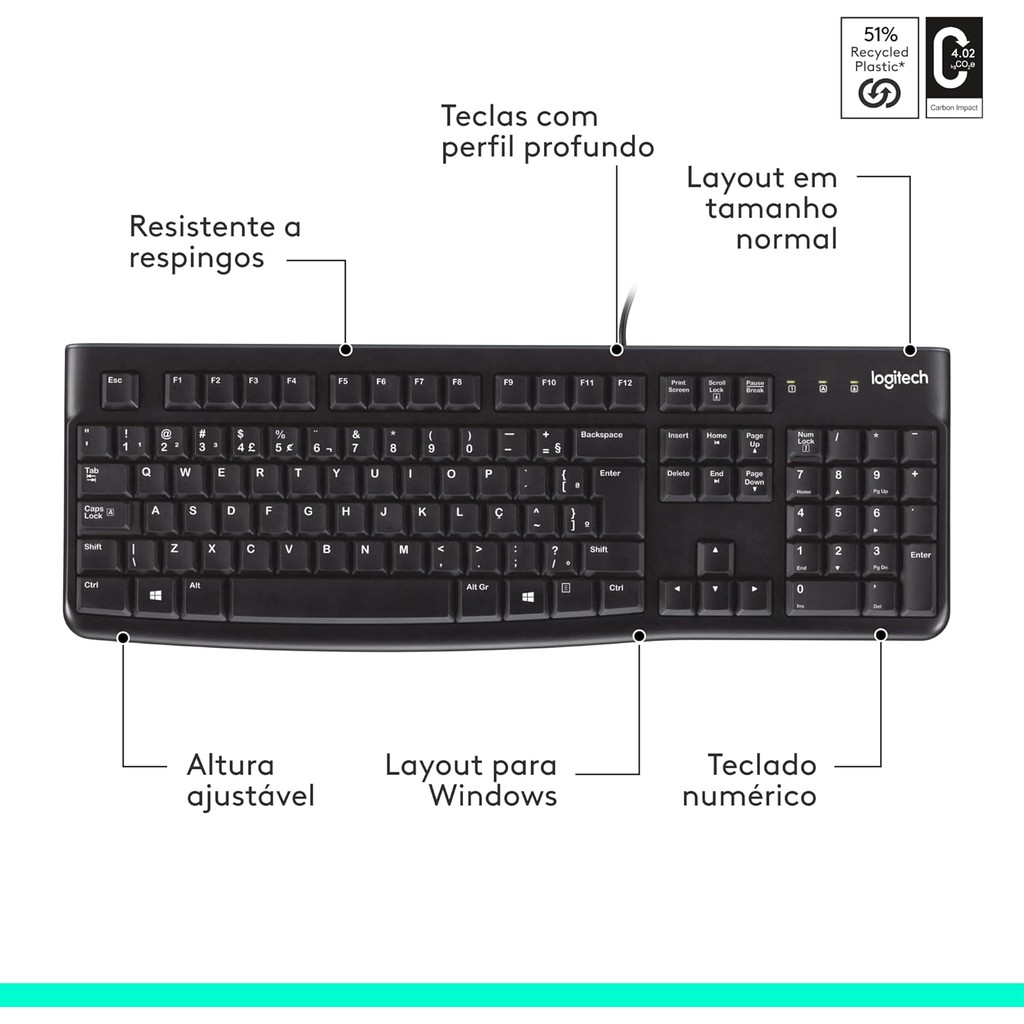 Teclado com fio USB Logitech K120, Resistente à Respingos