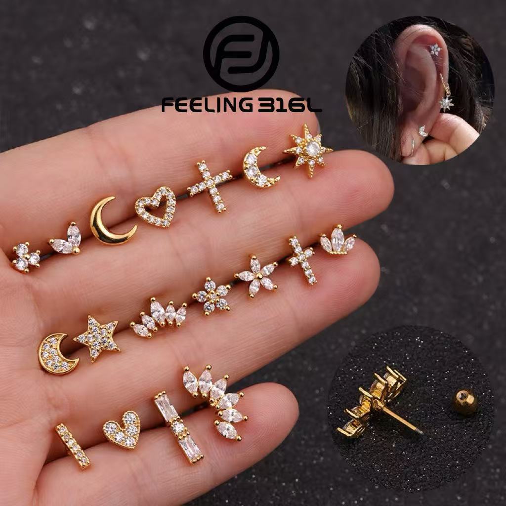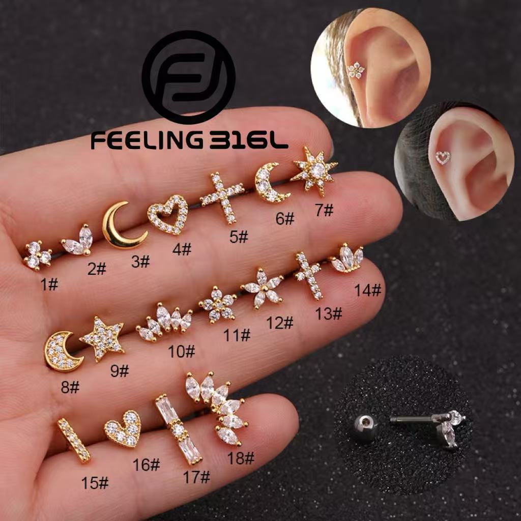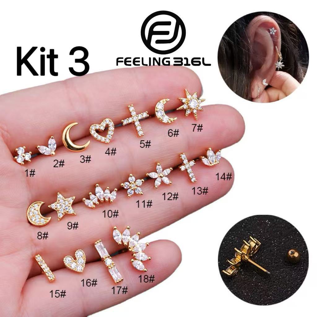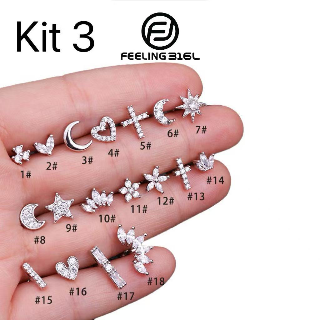 Feeling316L kit 3 Piercing Lua Estrela Da Flor Coração Cruz De Aço Inoxidável Tragus Diath Cartilage Helix Rook
