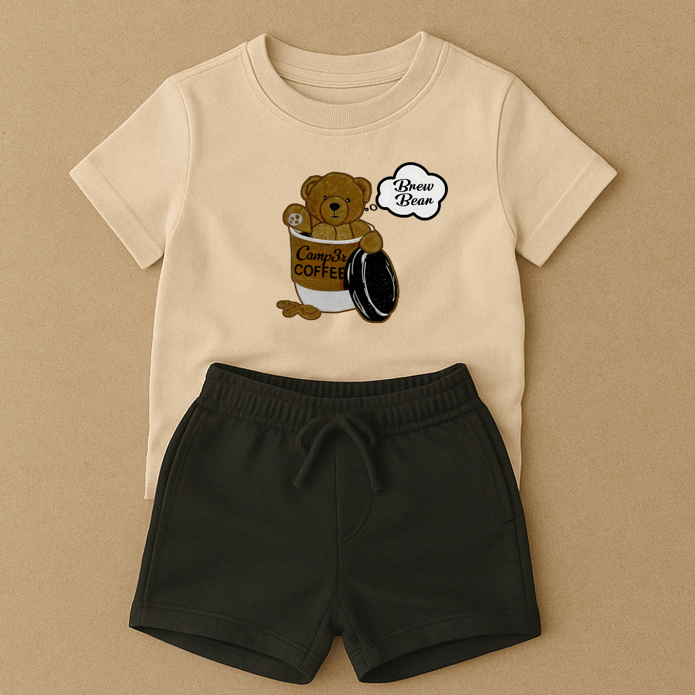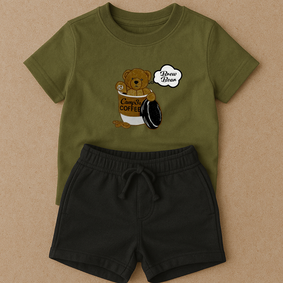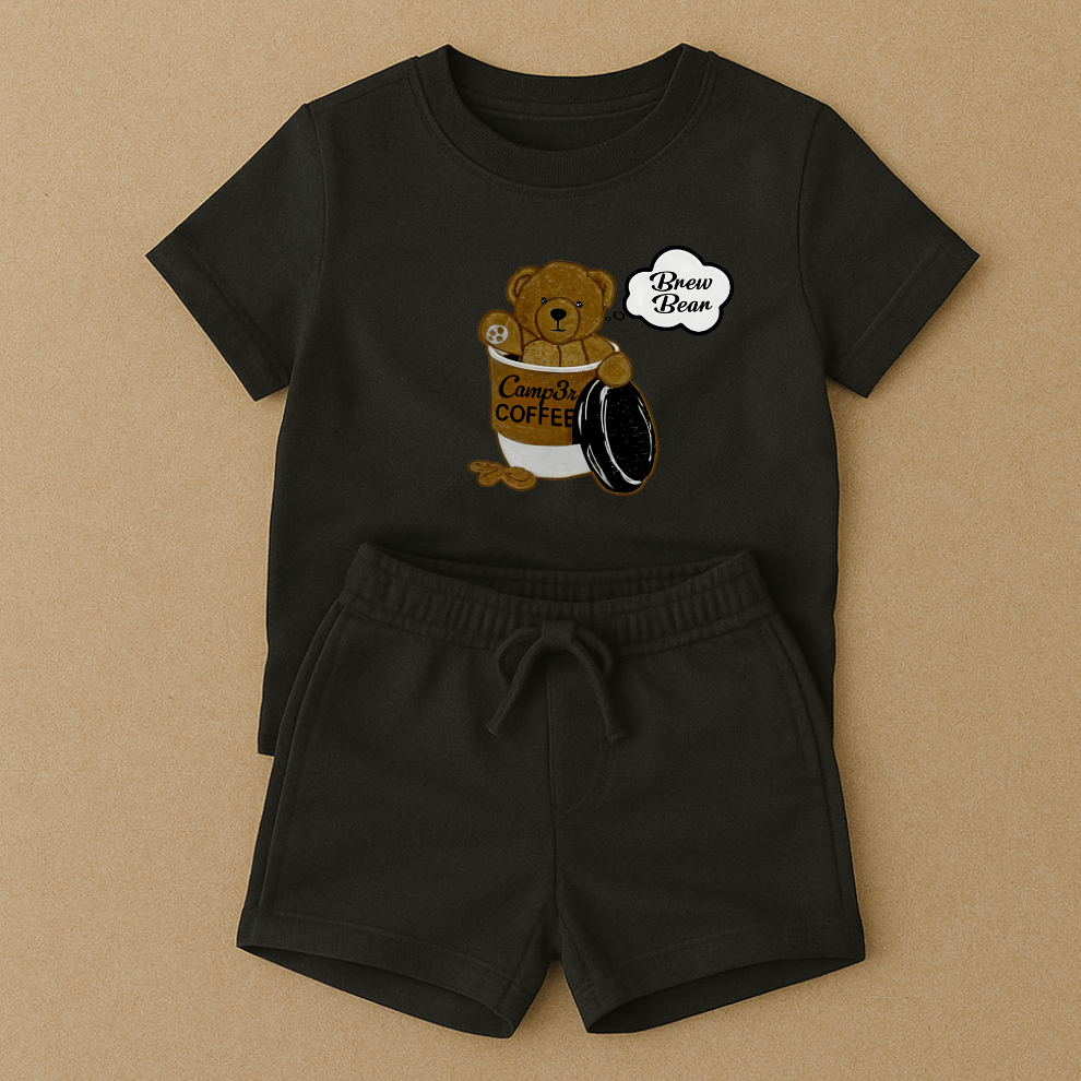 Camiseta Infantil Várias Cores Conjunto Para Menino Menina Bermuda em Moletom Preta Ursinho Café