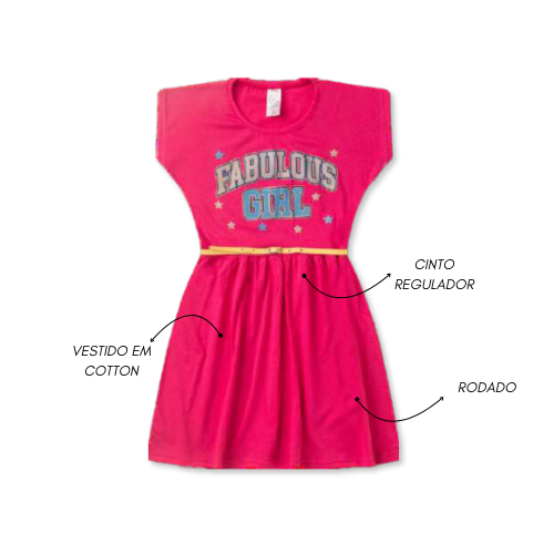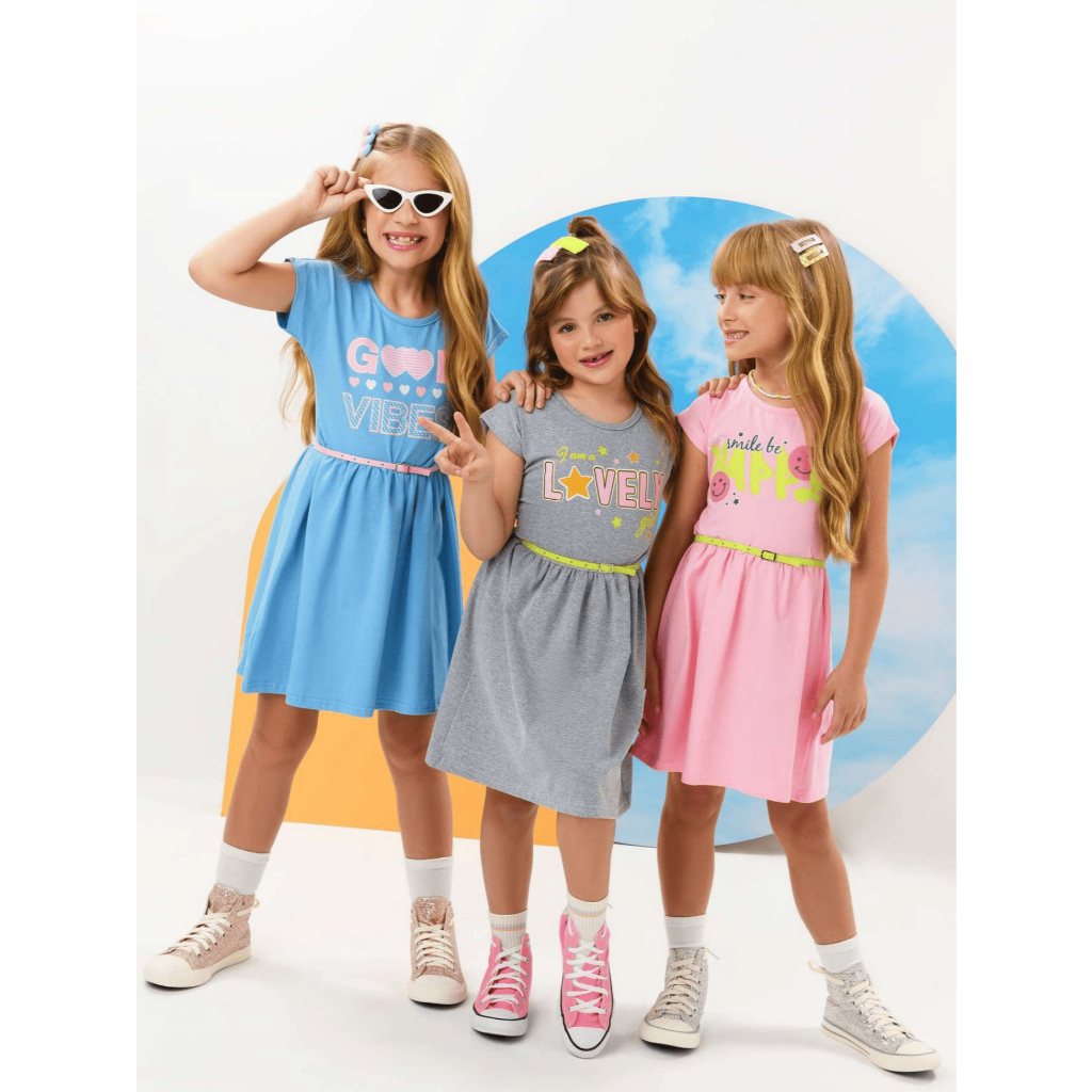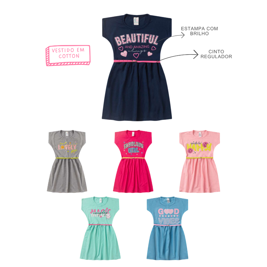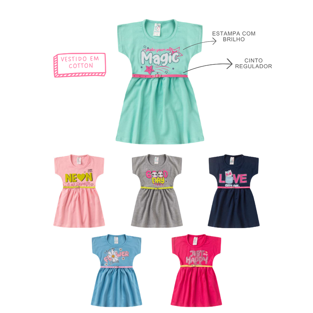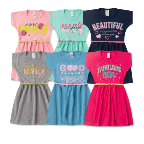 Kit 5 Peças Vestidos Rodados c/ Cinto Regulador Feminino Estampas Infantil 5 Vestidos Menina Verão