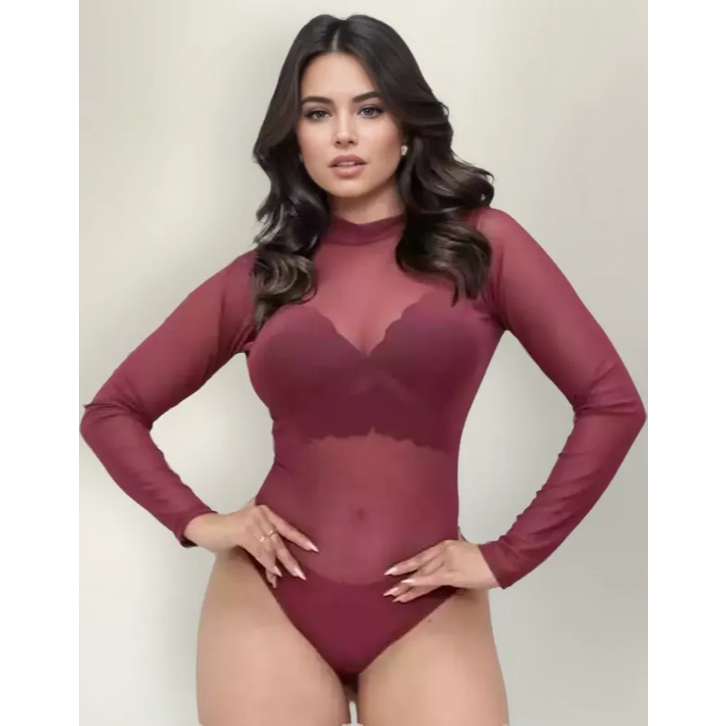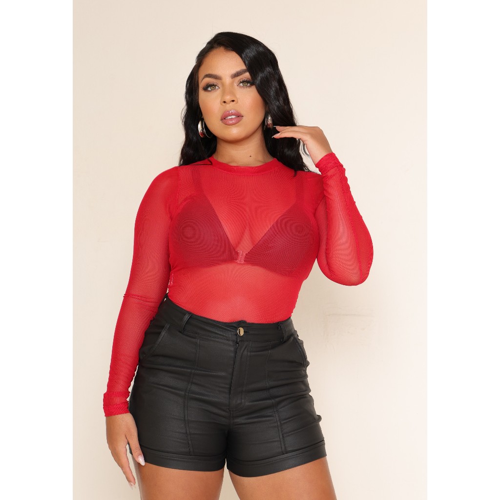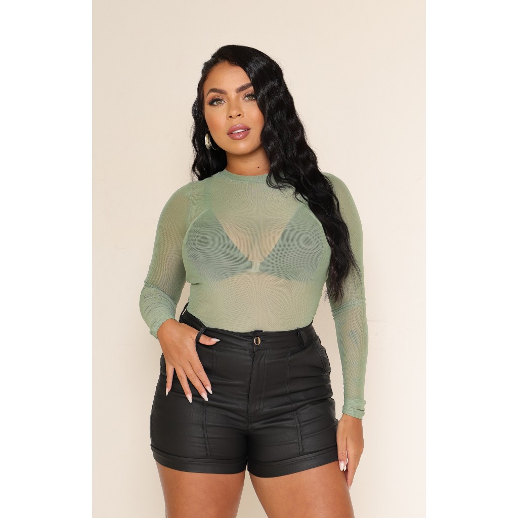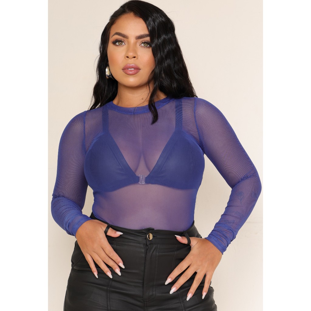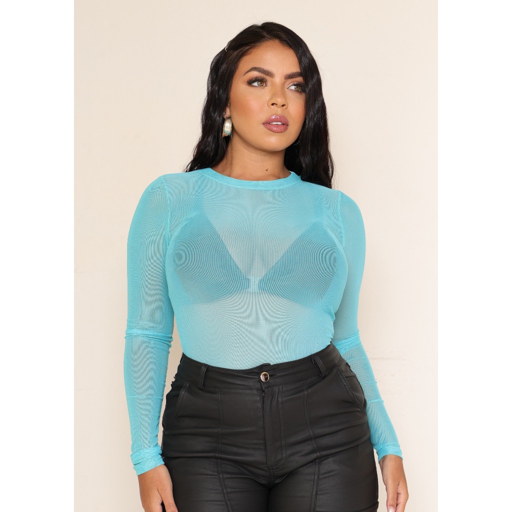 Body Blusa Tule Manga Larga Transparente Roupas Femininas
