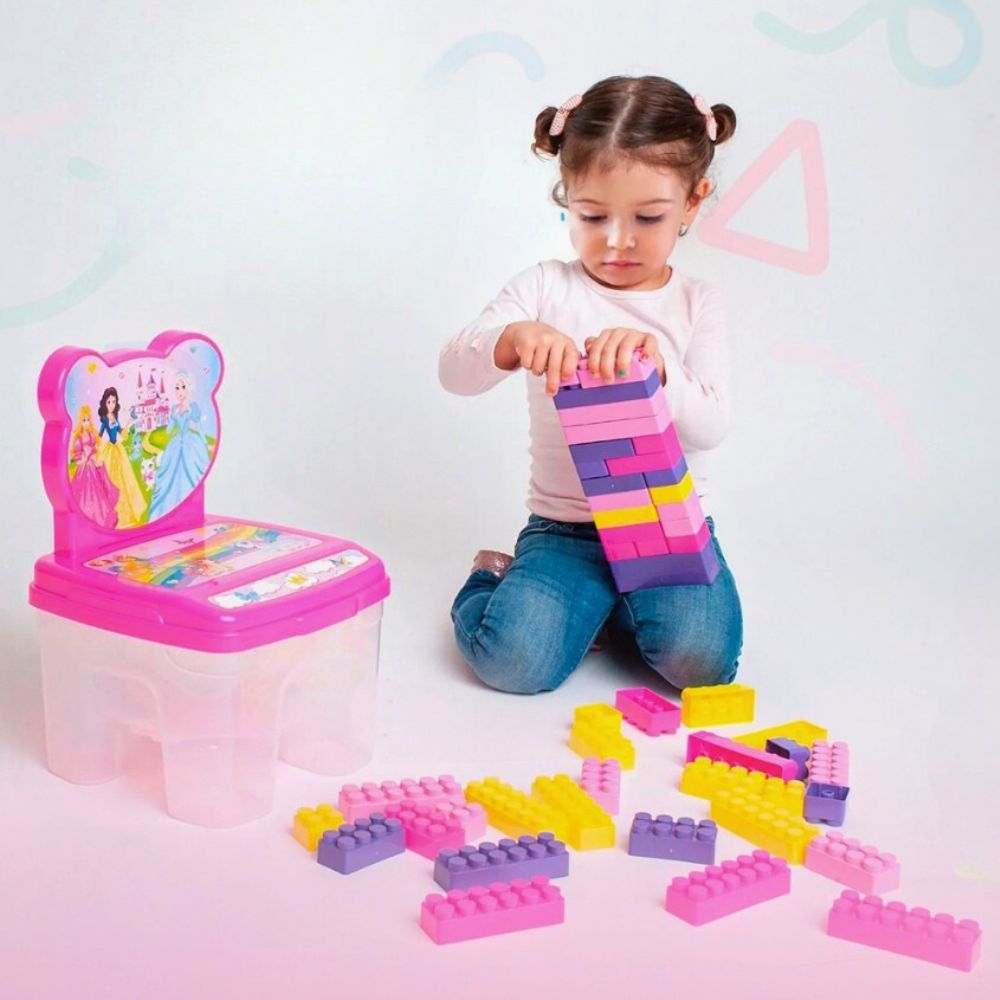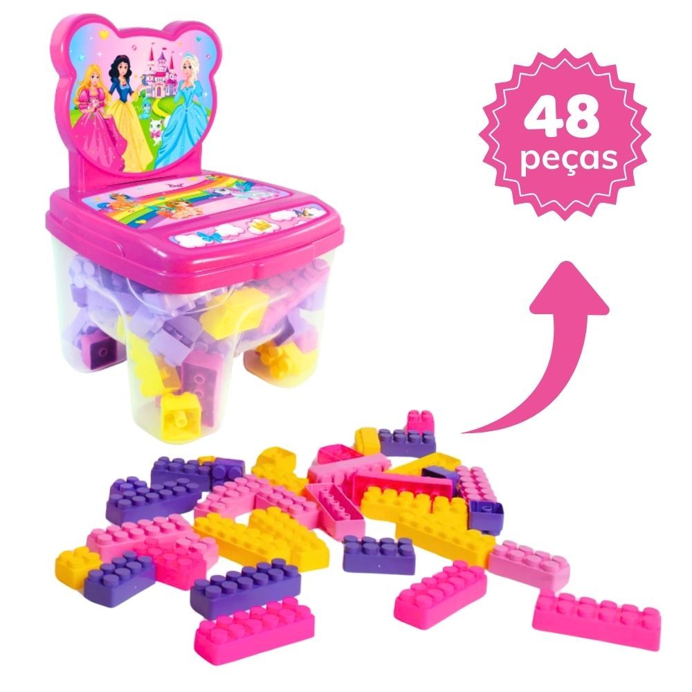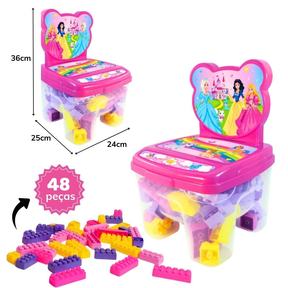Cadeira Infantil Princesas com Blocos de Montar Encaixe Educativo 48 Peças Grandes