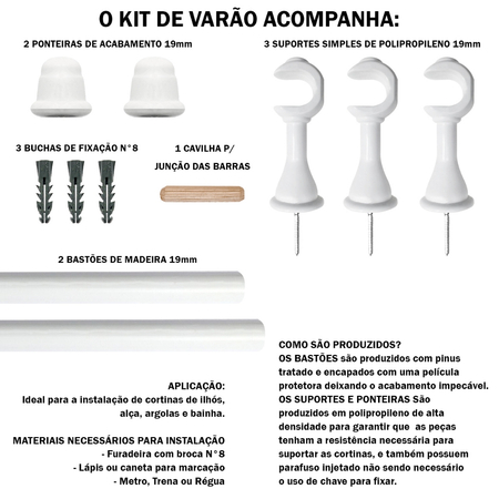 Kit Com Varão de Madeira Decorativo Para Cortina 2,00 Metros 19mm Com Kit De Ponteira + Suporte
