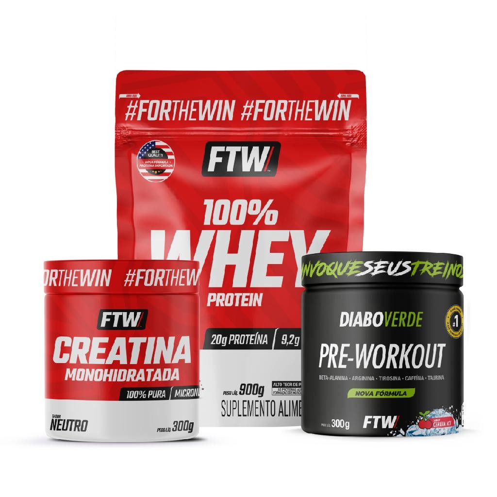 Kit 100%Whey Doce de leite 900gr refil+Pré treino Cereja Ice 300gr+ Creatina 300gr pote FTW