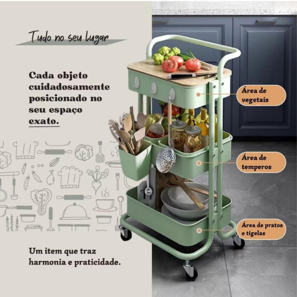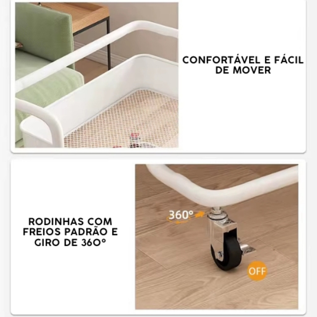 Carrinho Organizador Multiuso Laterais Aço - 3 Prateleiras