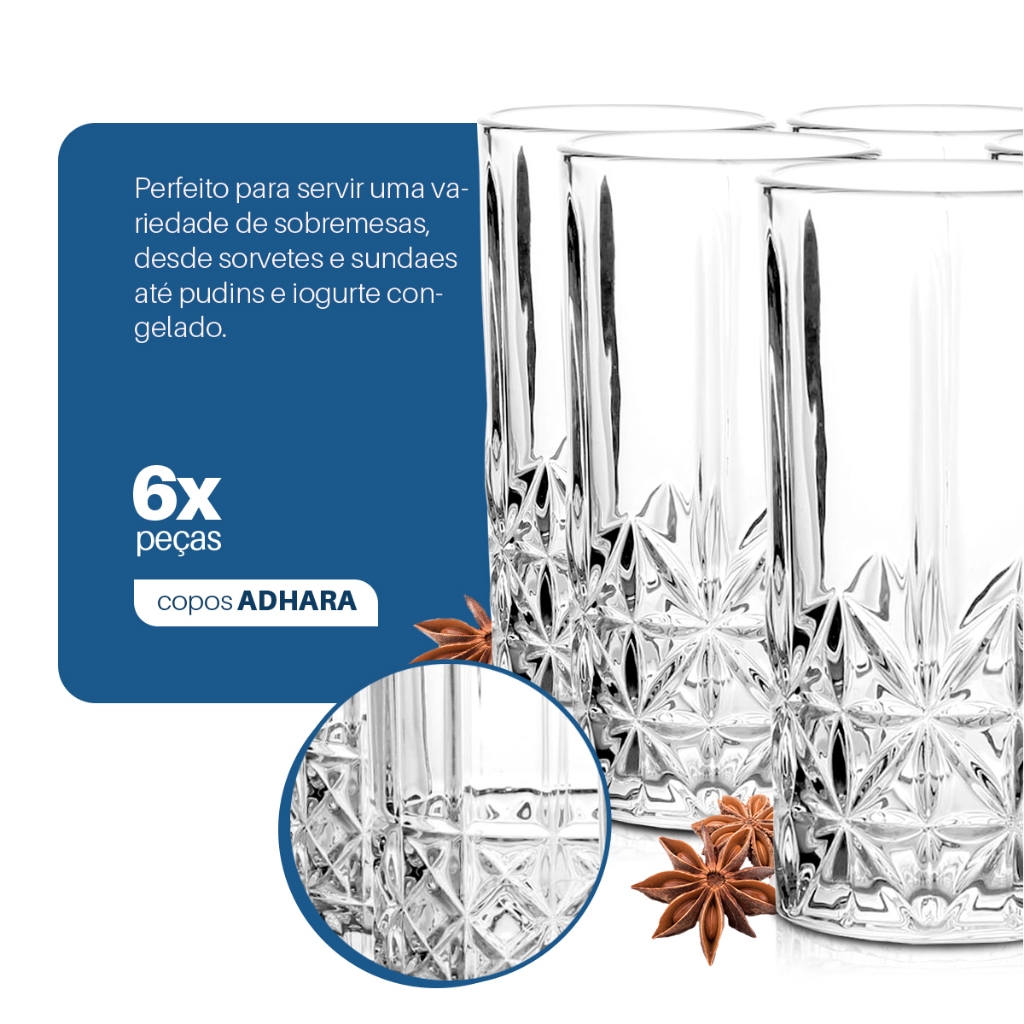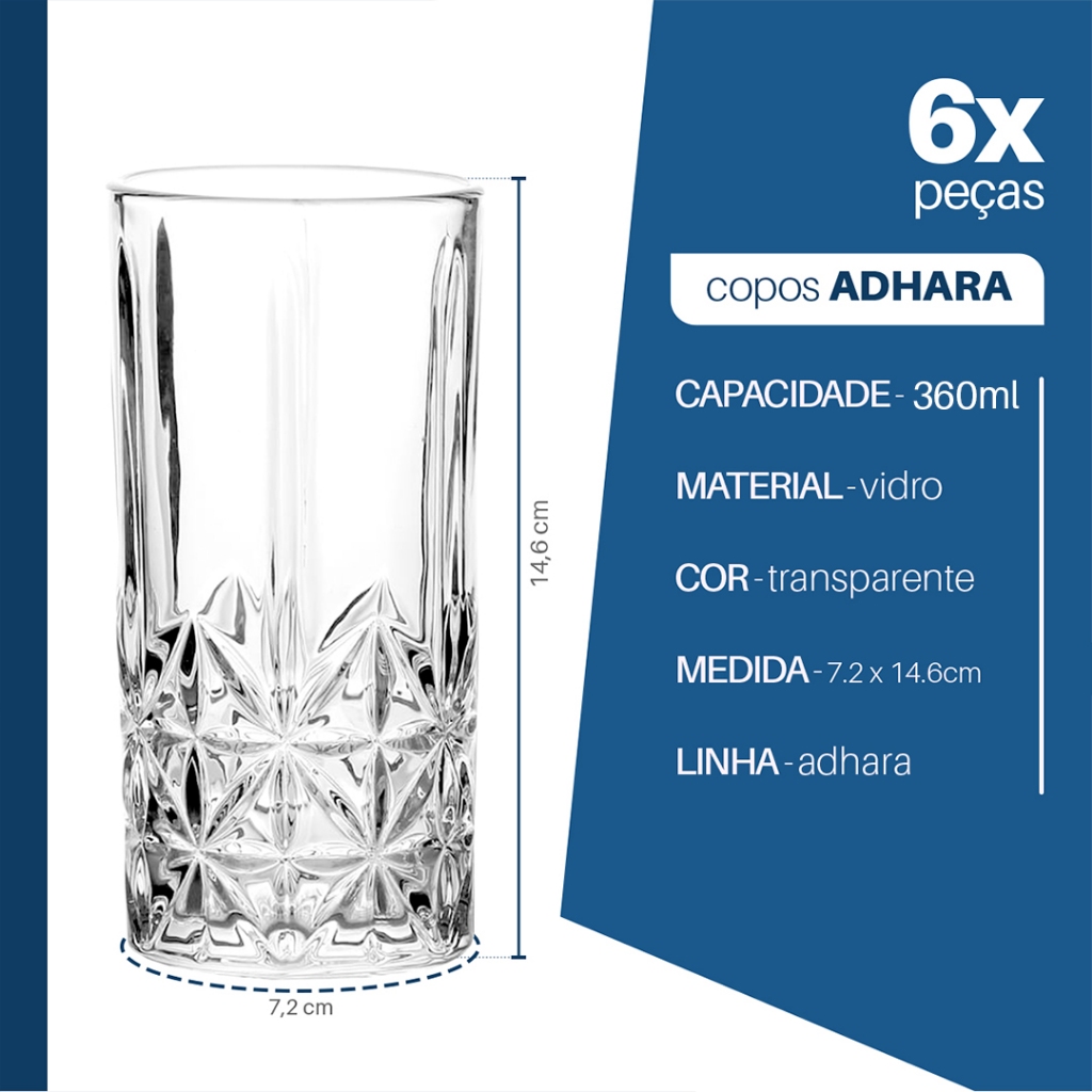 Jogo 6 Copos de Vidro Adhara 360ml – Design em Relevo Estilo Cristal
