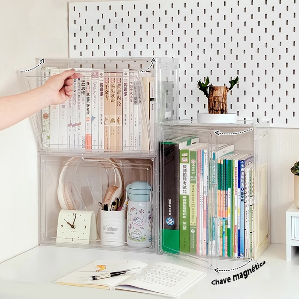 Caixa Organizadora Livros Grande Acrílico Transparente com Tampa Exposição Proteção Antipoeira e Empilhável
