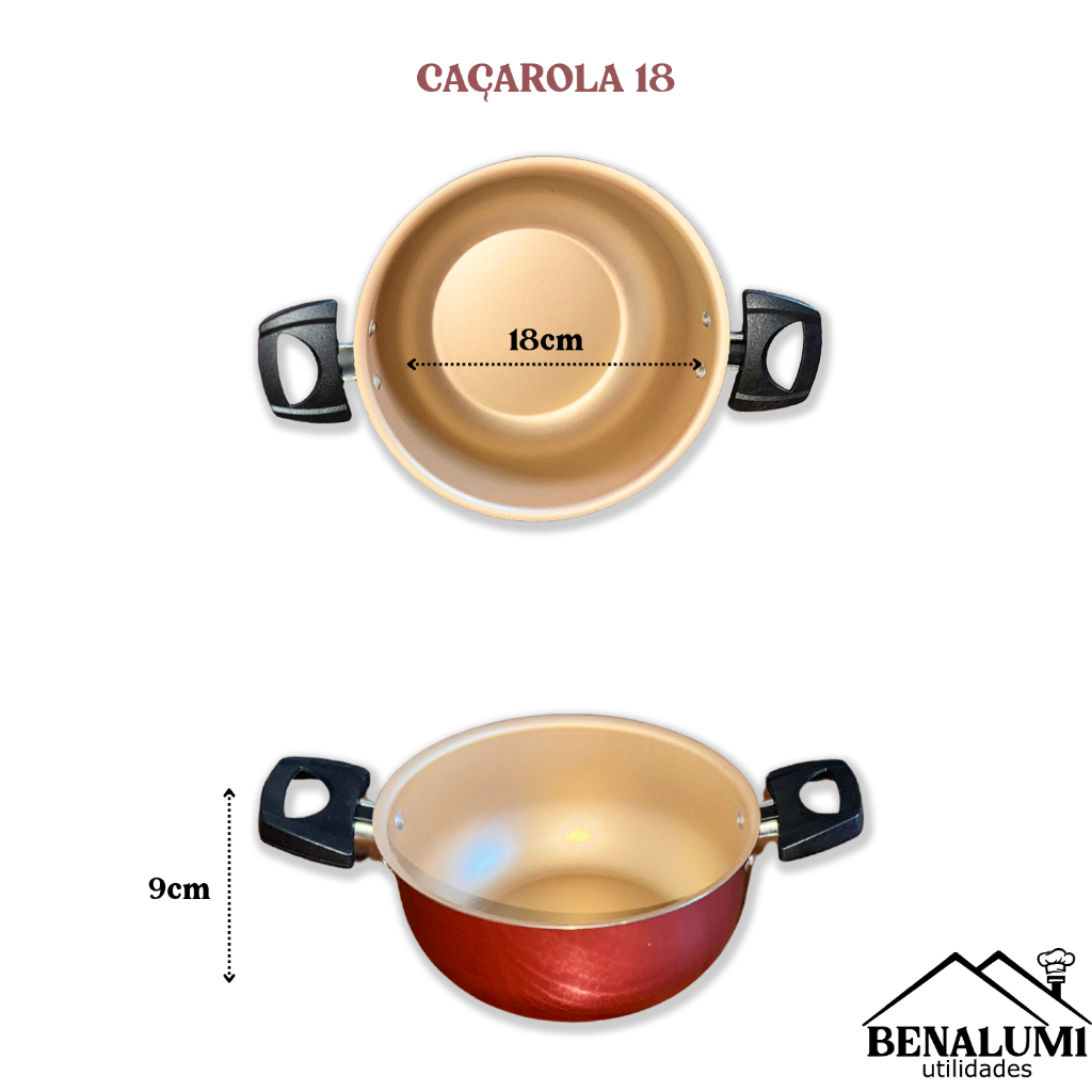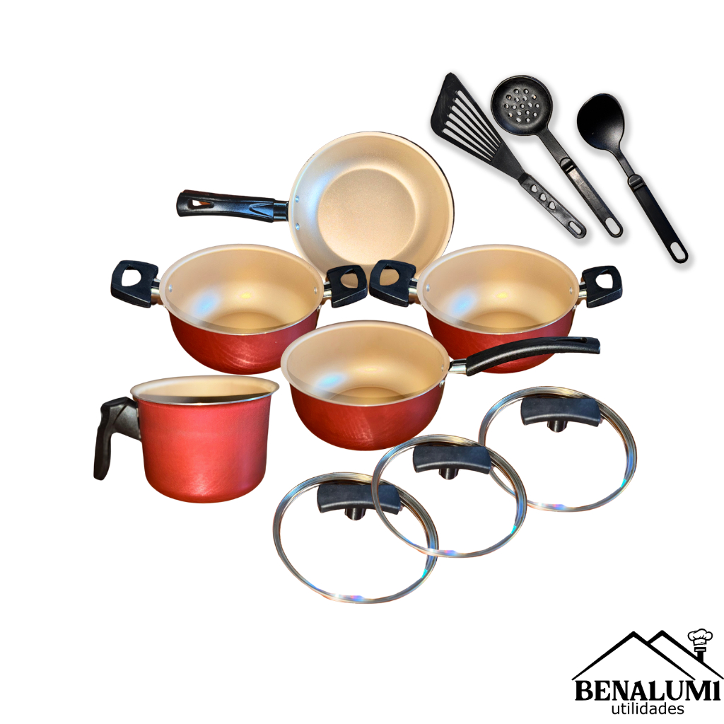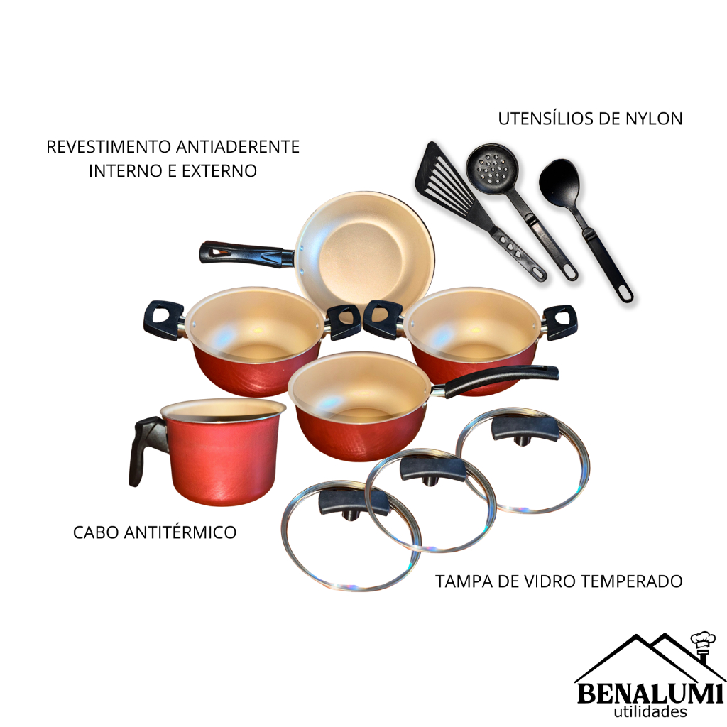 Kit Panelas e Frigideira Antiaderente Cereja com Tampa de Vidro + Utensílios Nylon