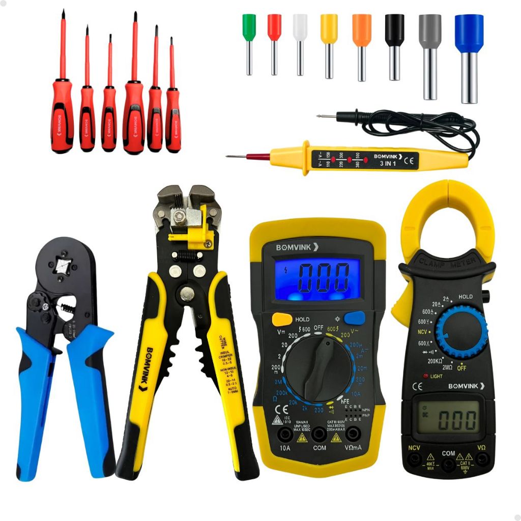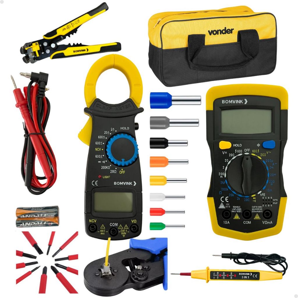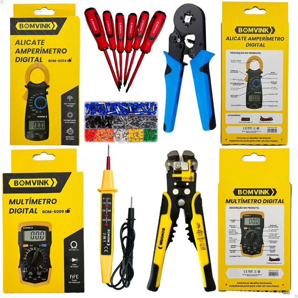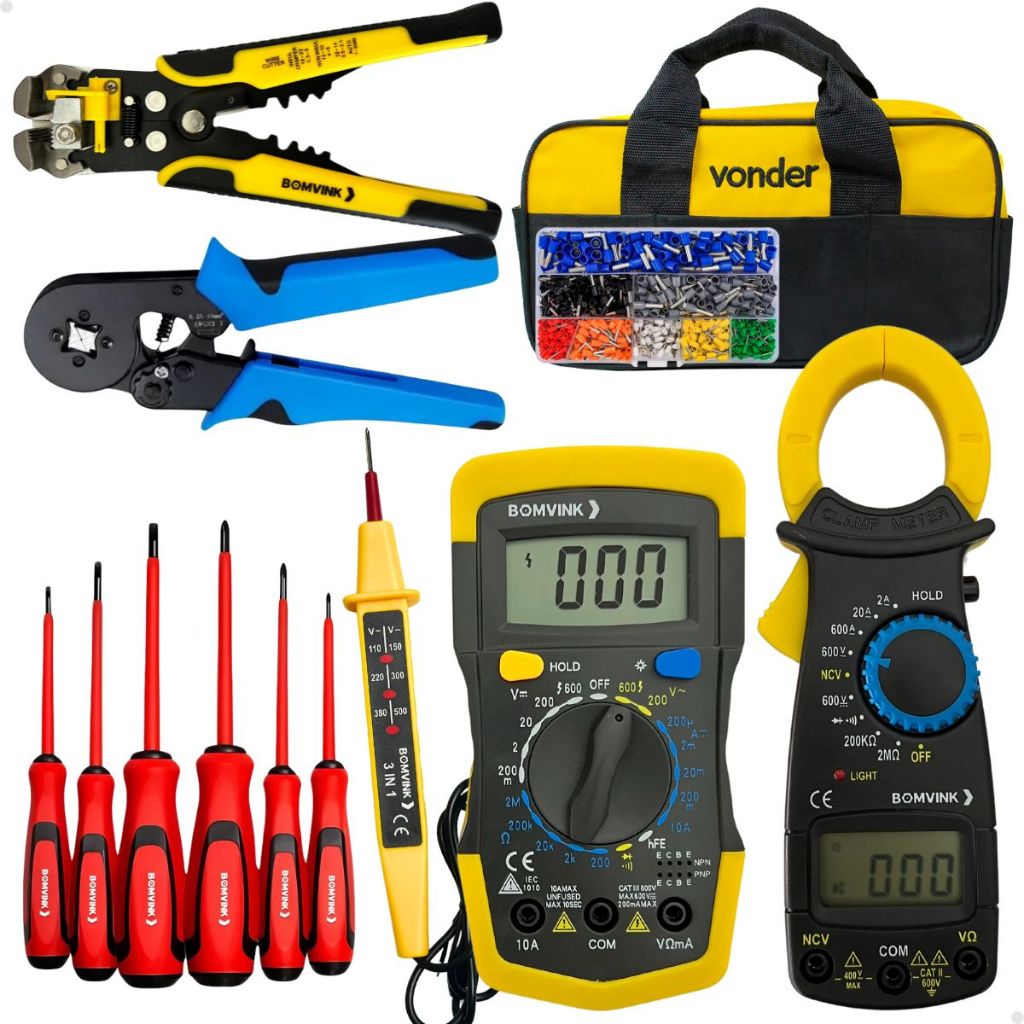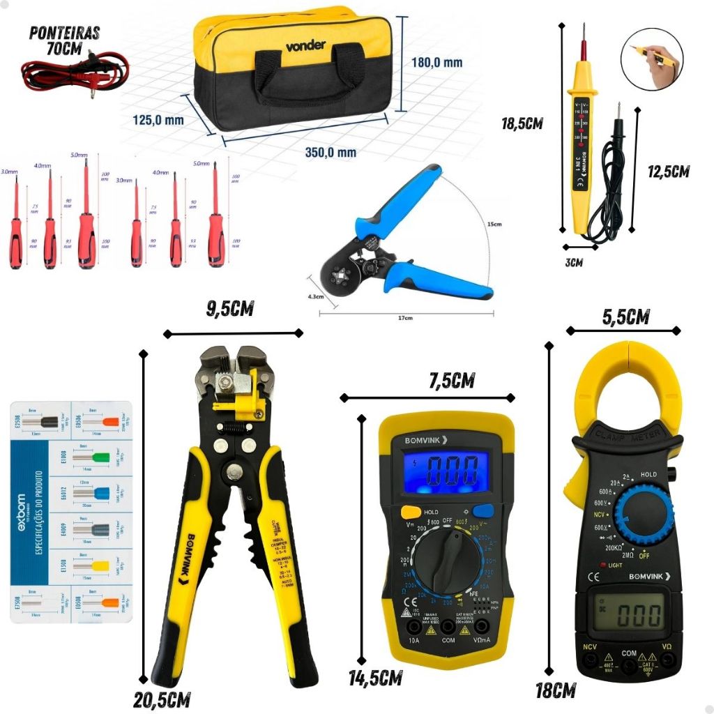 Kit Eletricista Multímetro Amperímetro Chaves Isoladas Bolsa Alicates Decapador Prensa Ilhós