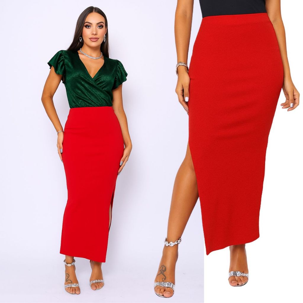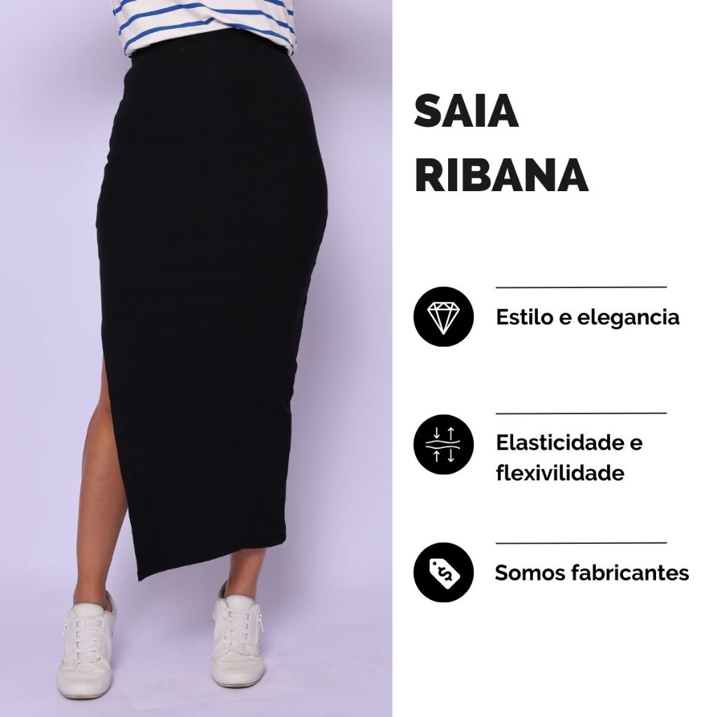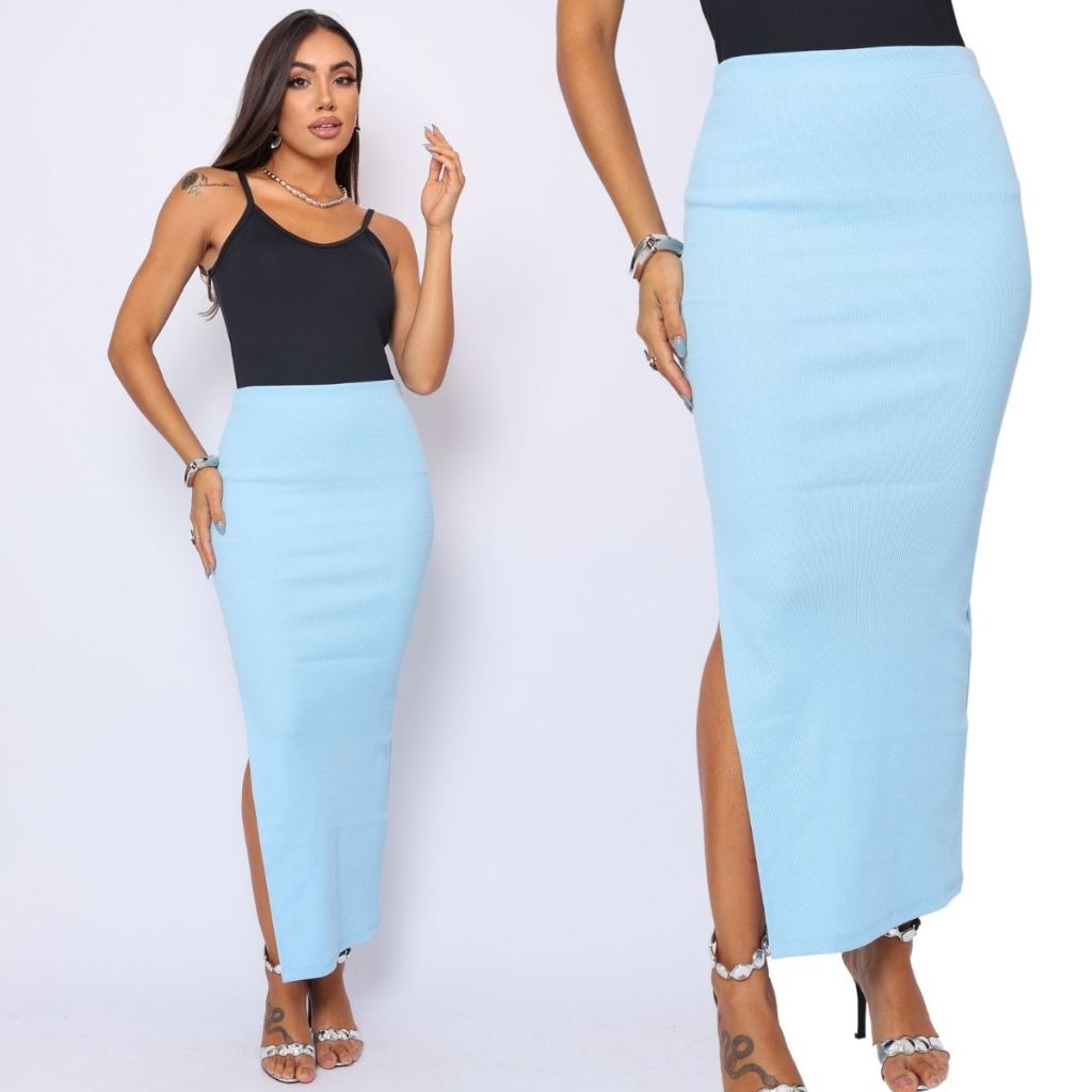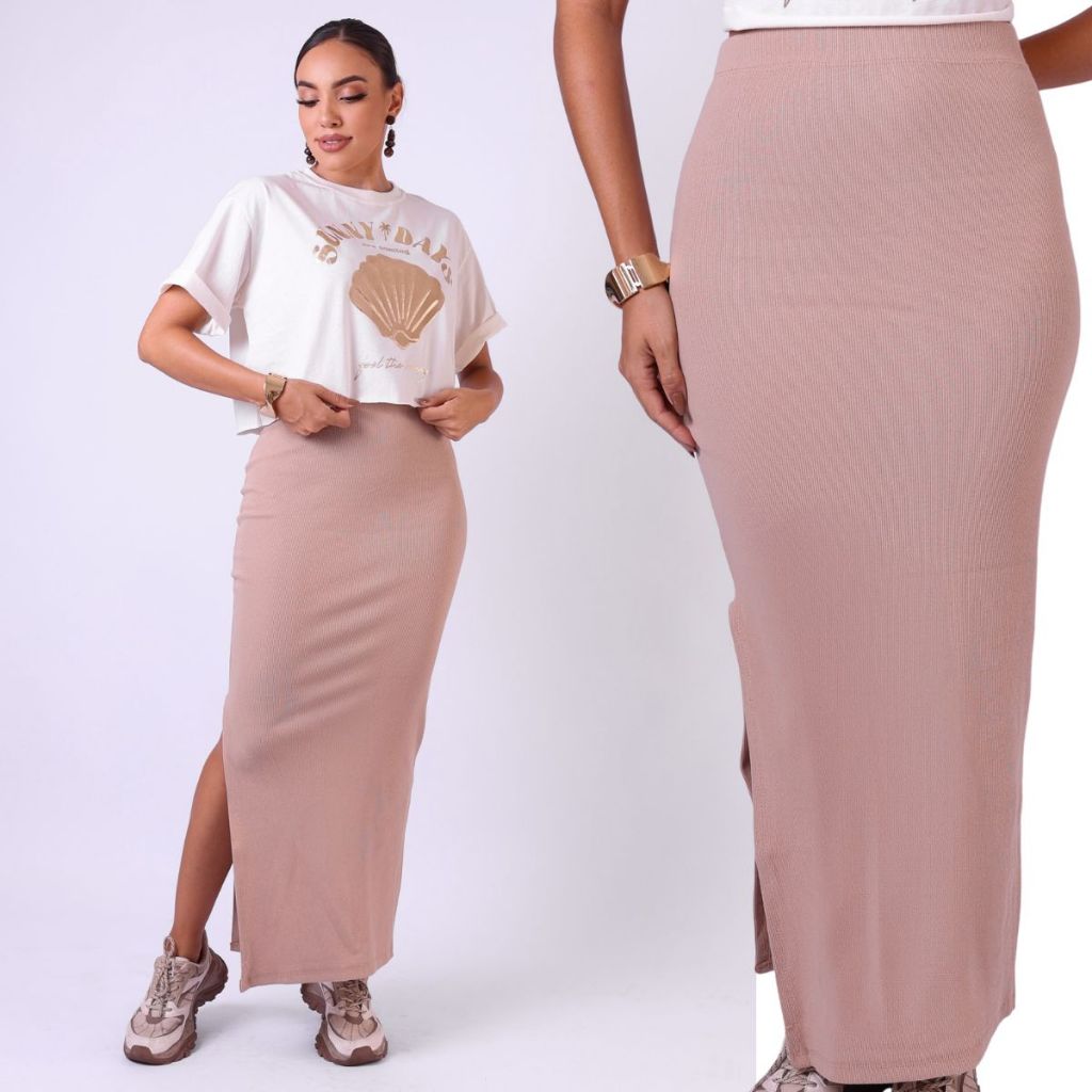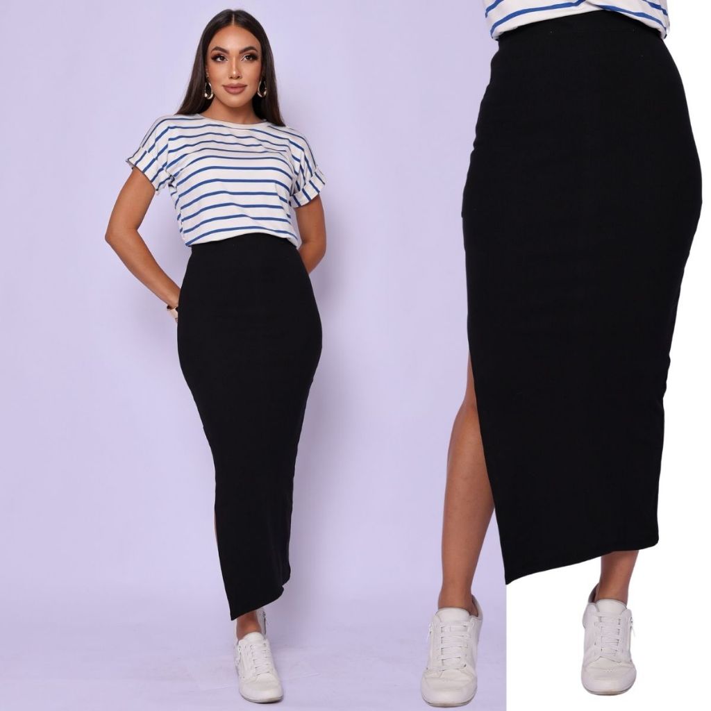Saia Basica Longa em Ribana com Fenda Lycra Modeladora Cintura Alta