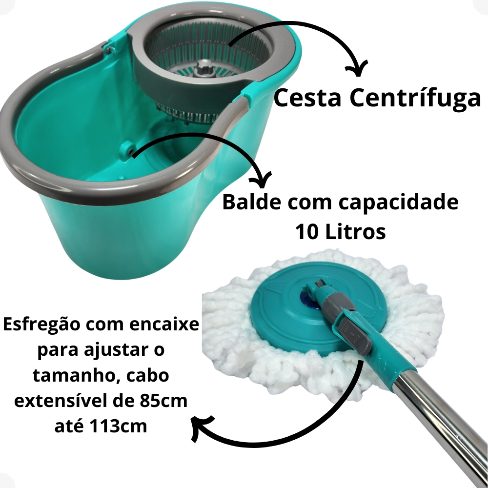 Esfregão Mop Giratório com Centrifuga em Plástico Balde de 10 Litros Cabo Extensível Star Limp Magic