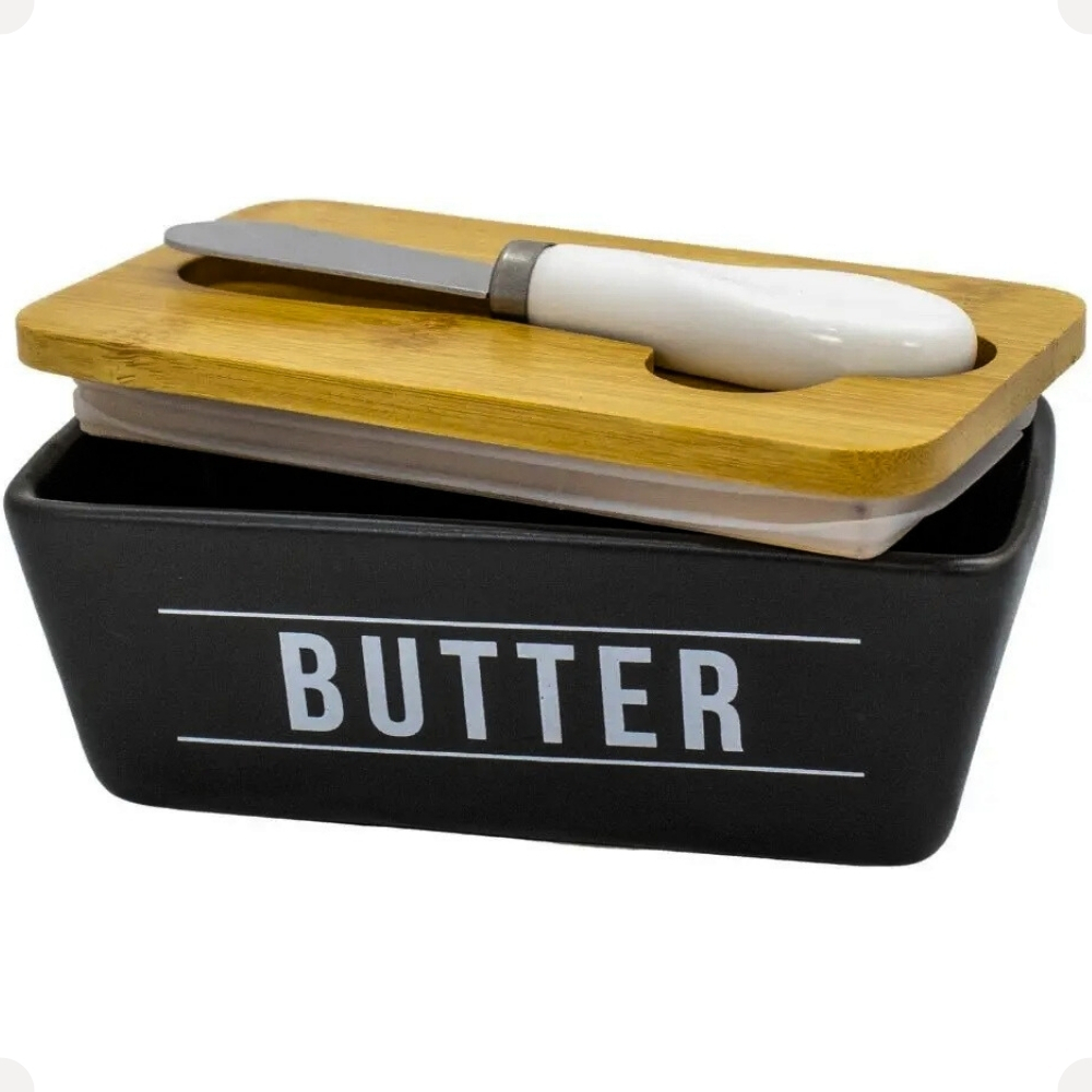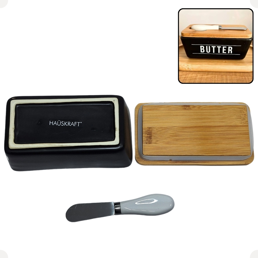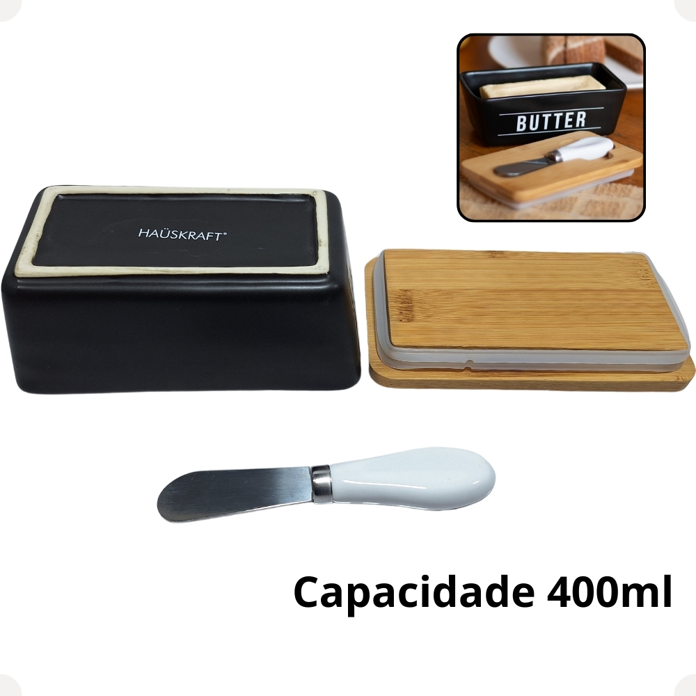 Manteigueira Com Tampa e Faca 400ml Porcelana Preto Fosco Bambu Mesa Posta Linha Manhattan Haüskraft