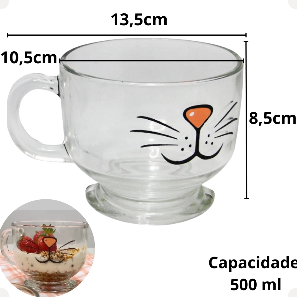 Caneca Xícara Jumbo de Vidro Resistente Cat Gato Gatinho Para Café Chá Caldo Cereal 500ml Haüskraft.