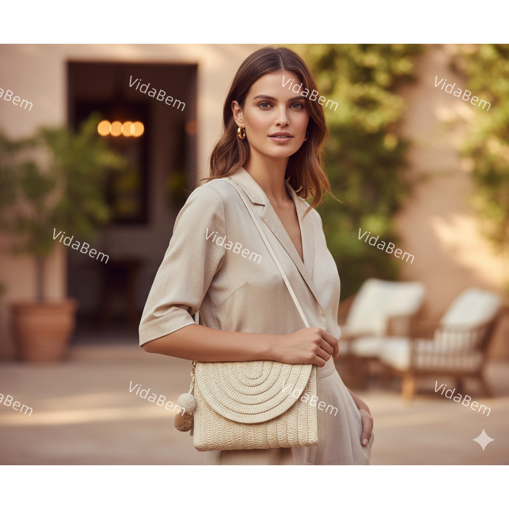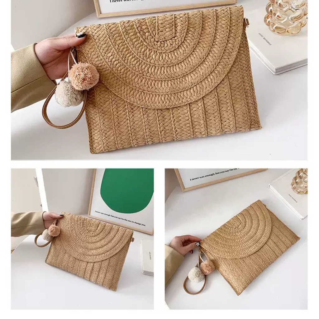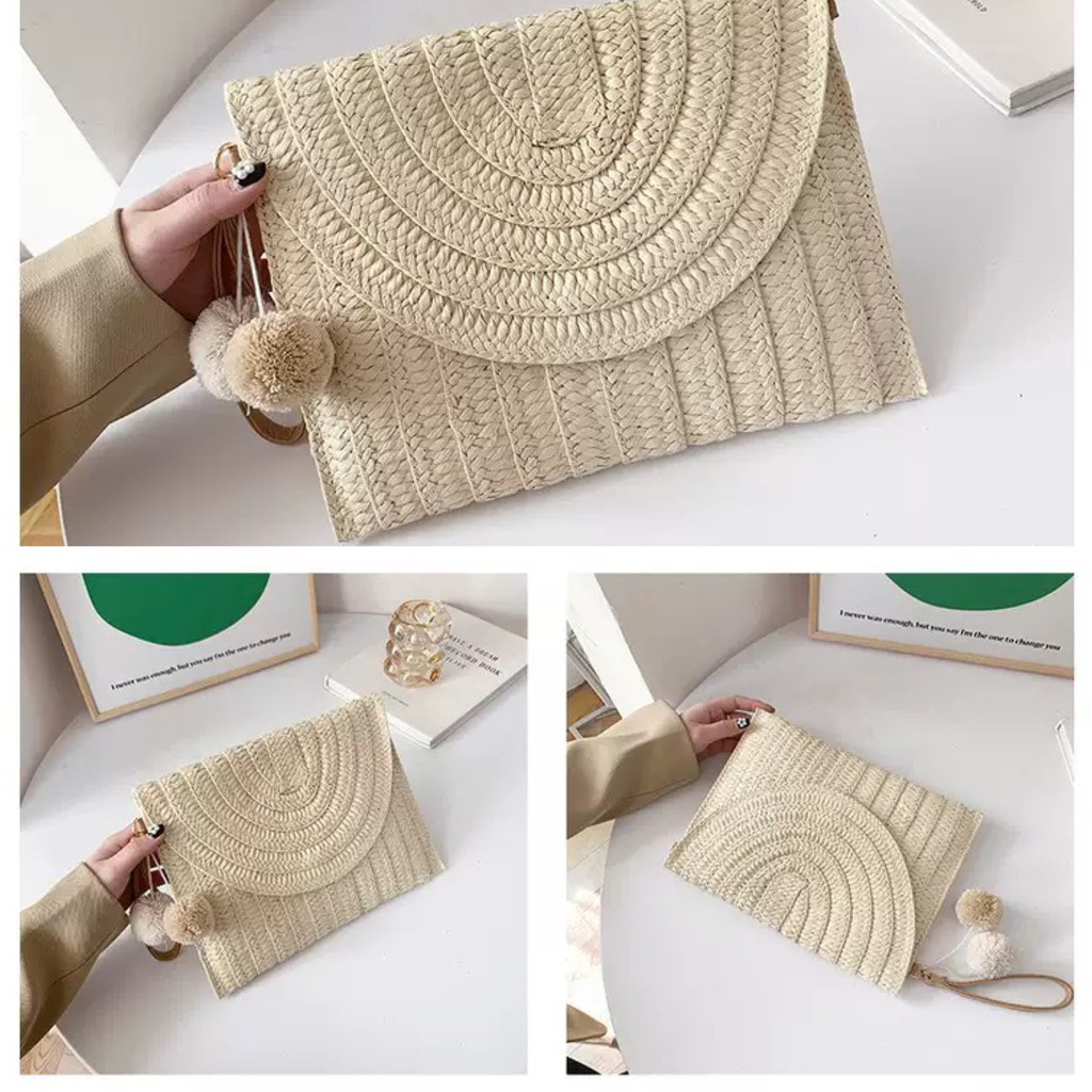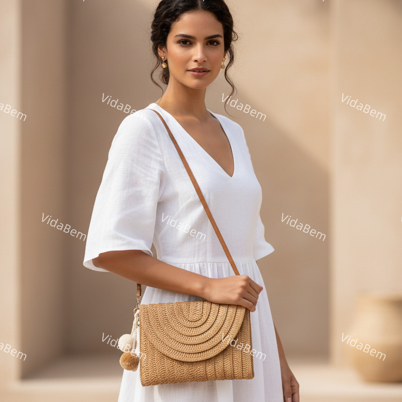 Clutch Bolsa de Palha Artesanal com Pompom e Alça Transversal Removível Estilo Praia e Casual
