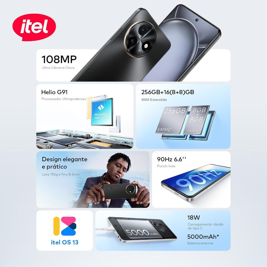 Celular Smartphone Itel S24 8GB RAM + 256GB Cam 108MP Tela 6.6" Global Dual Sim