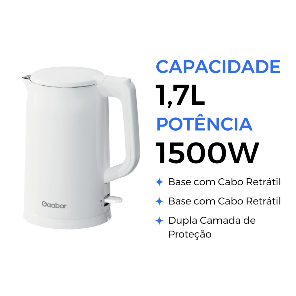 Chaleira Elétrica 1.7L 110v/220v Gaabor Aço Inox Filtro Coador e Desligamento Automático