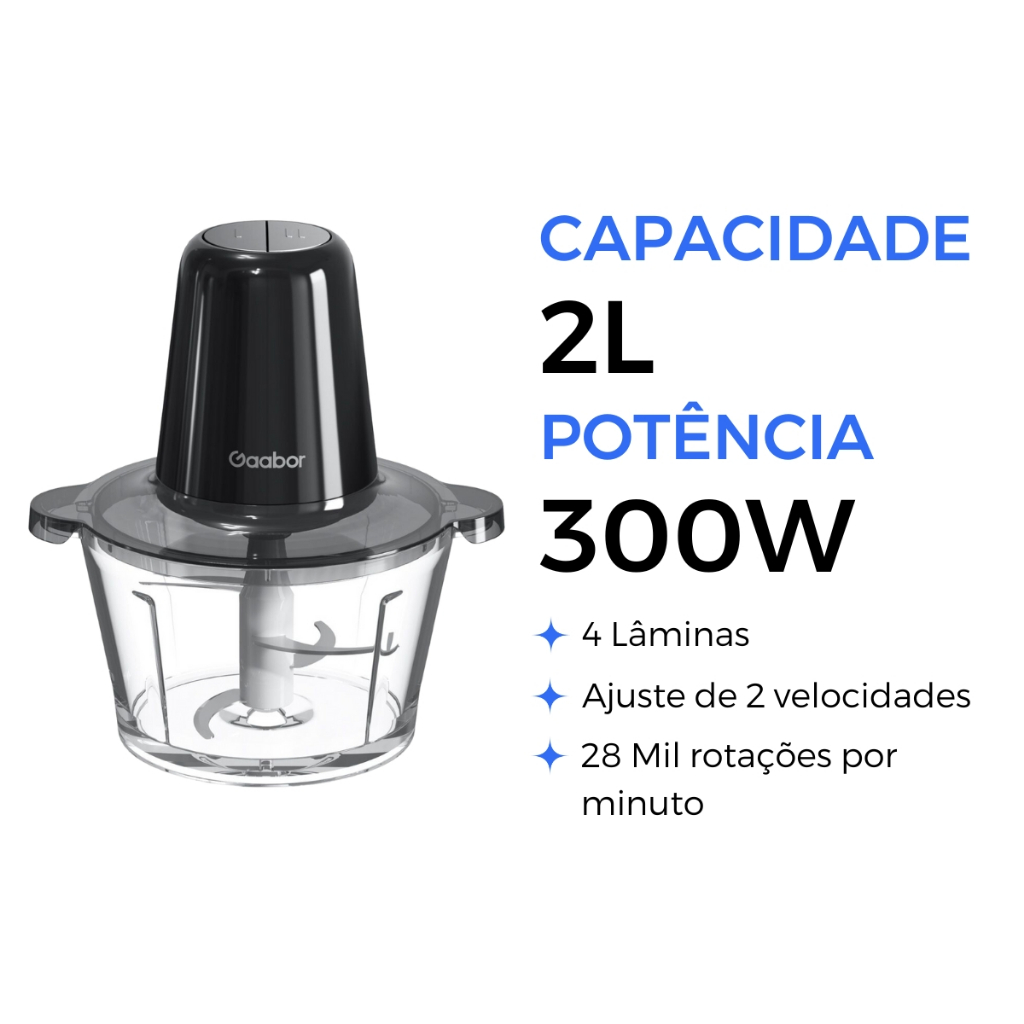 Processador Gaabor 2L 300W – 4 Lâminas Inox, Copo de Vidro, Ideal para Legumes e Carnes