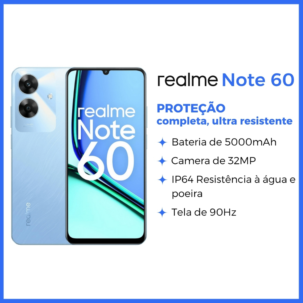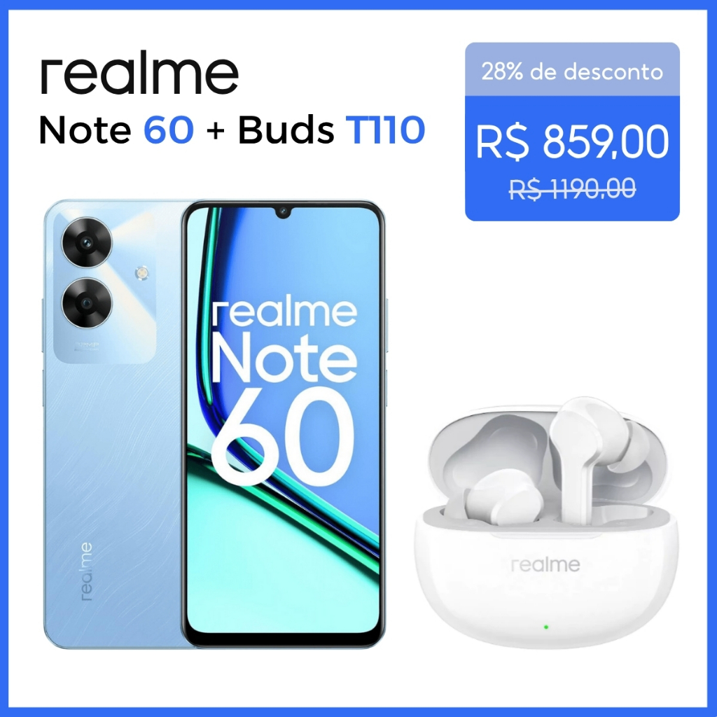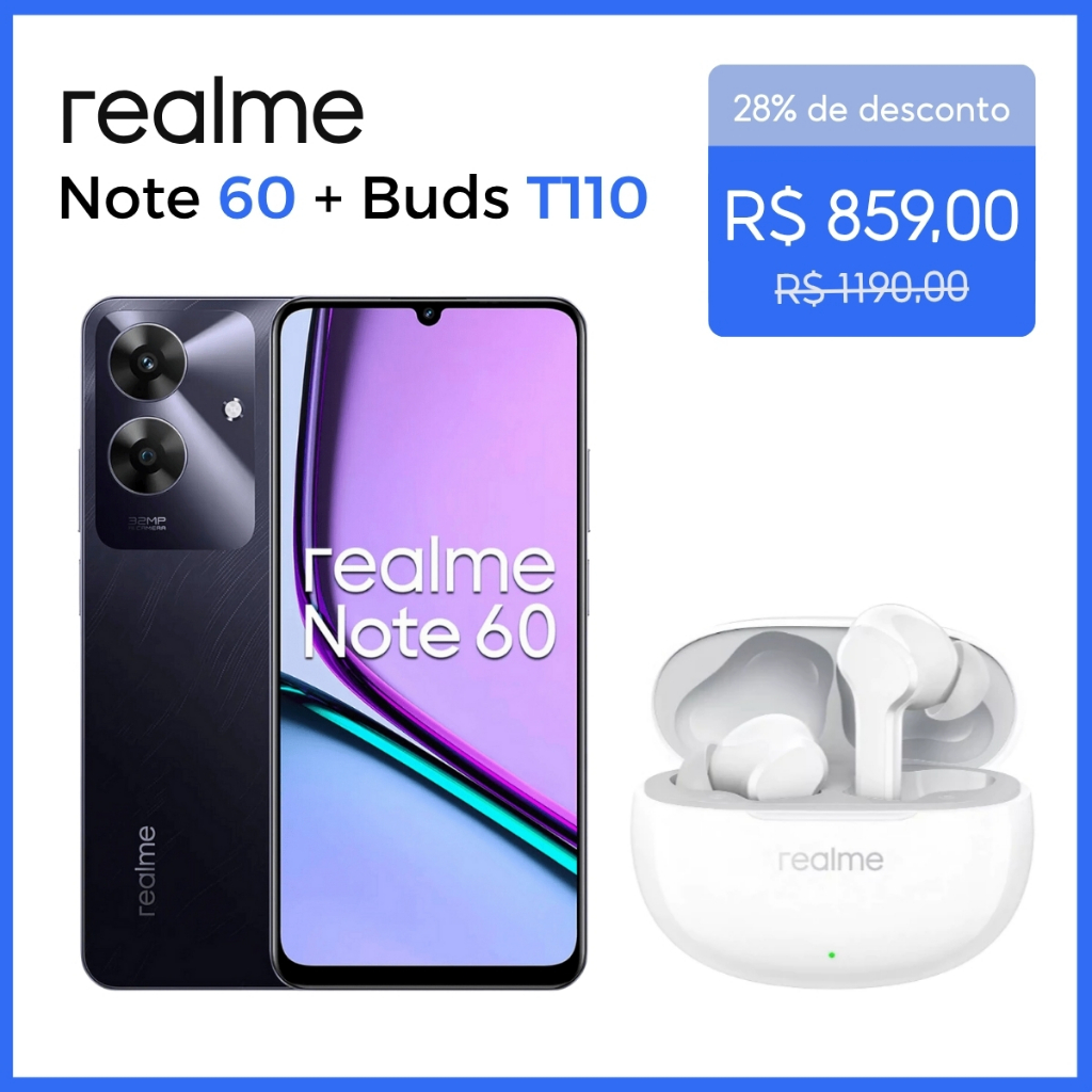 Celular Realme Note 60 Dual SIM 3GB RAM/64GB ROM + Fones de Ouvido Realme À Prova D'água IPX5 Com Cancelamento De Ruído