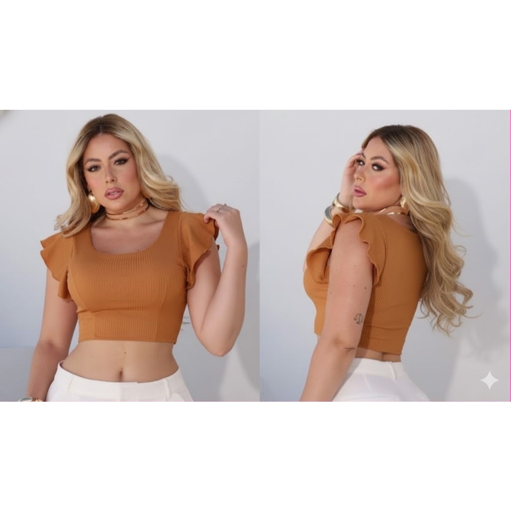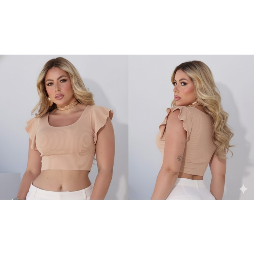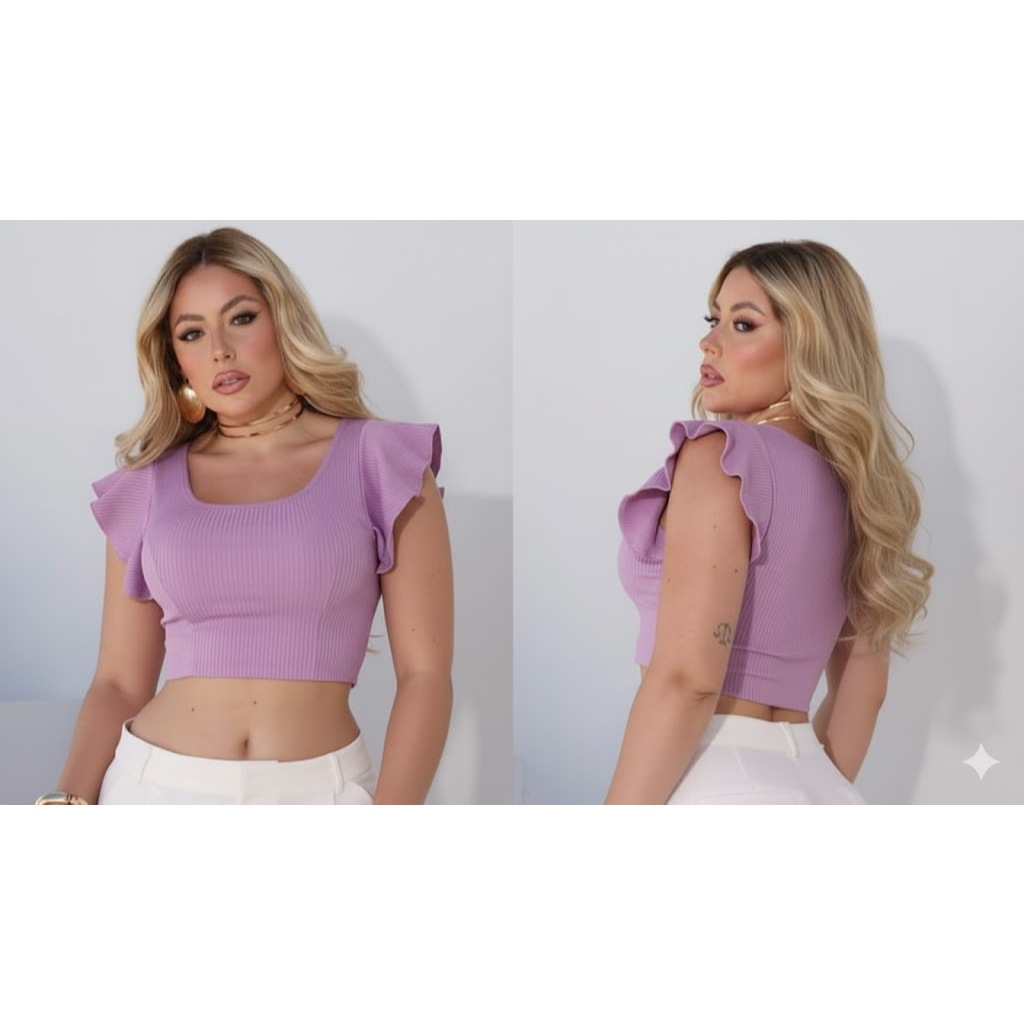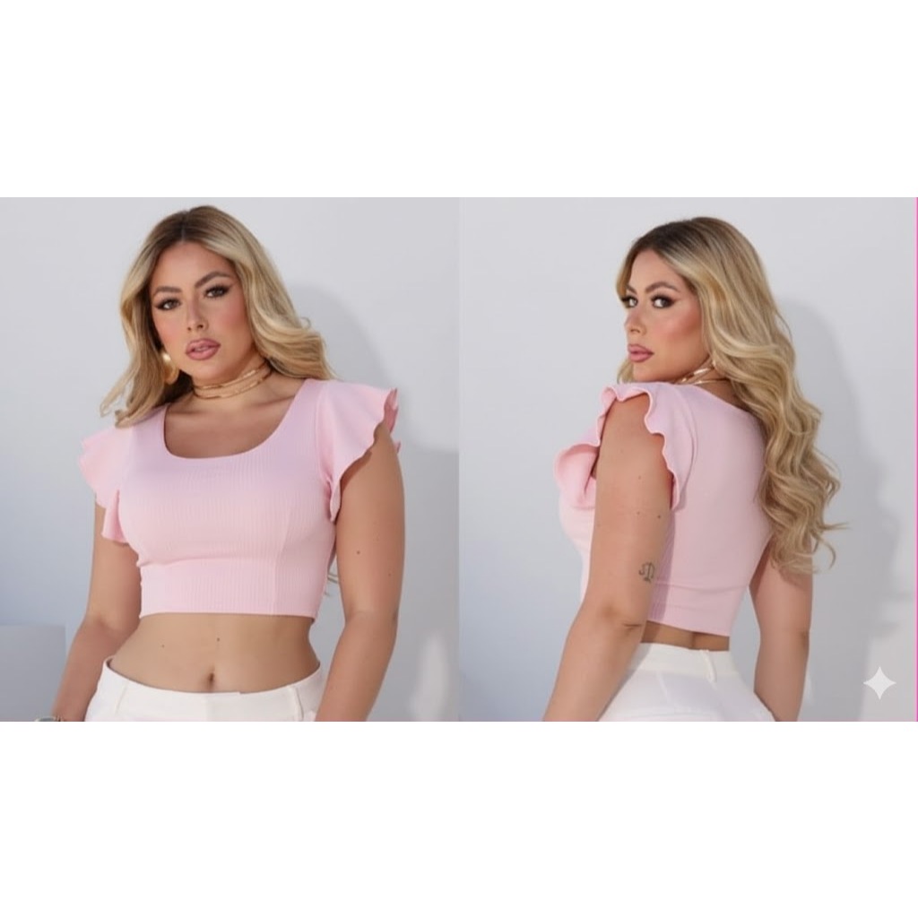 cropped canelado manga curta babado